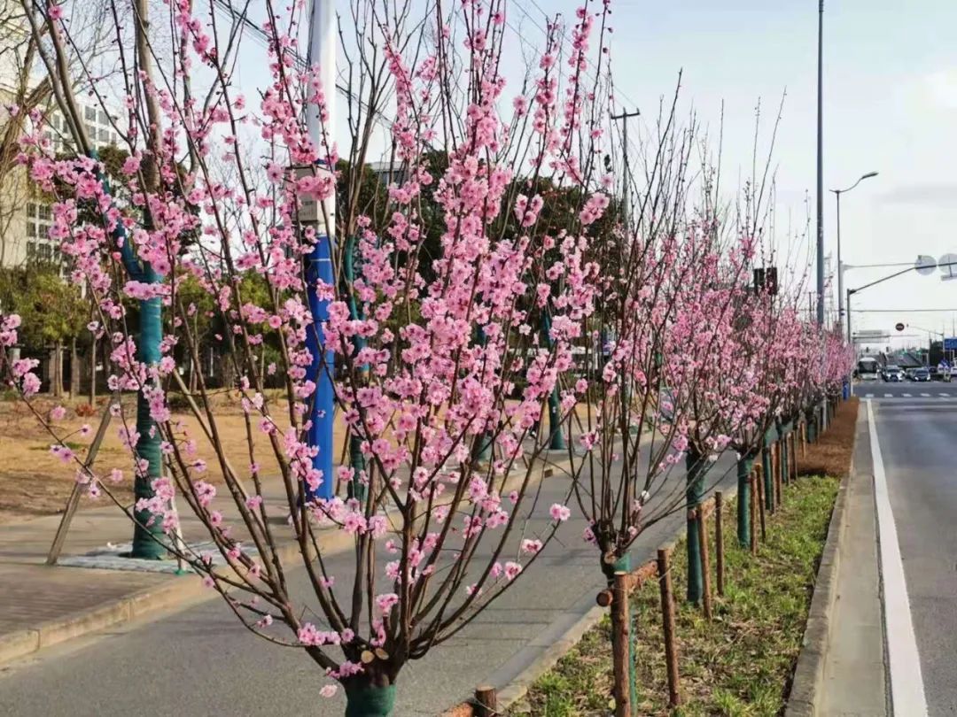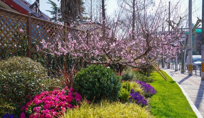 龙华(西)路为单幅路双向车道,长700米,道路以玉簪作为主体开花植物,搭配种植木本、宿根和草本植物。两侧采用果桃和花桃混种的形式,打造了桃花特色景观。桃花次第绽放,色彩浓淡相宜,高低错落相彰。