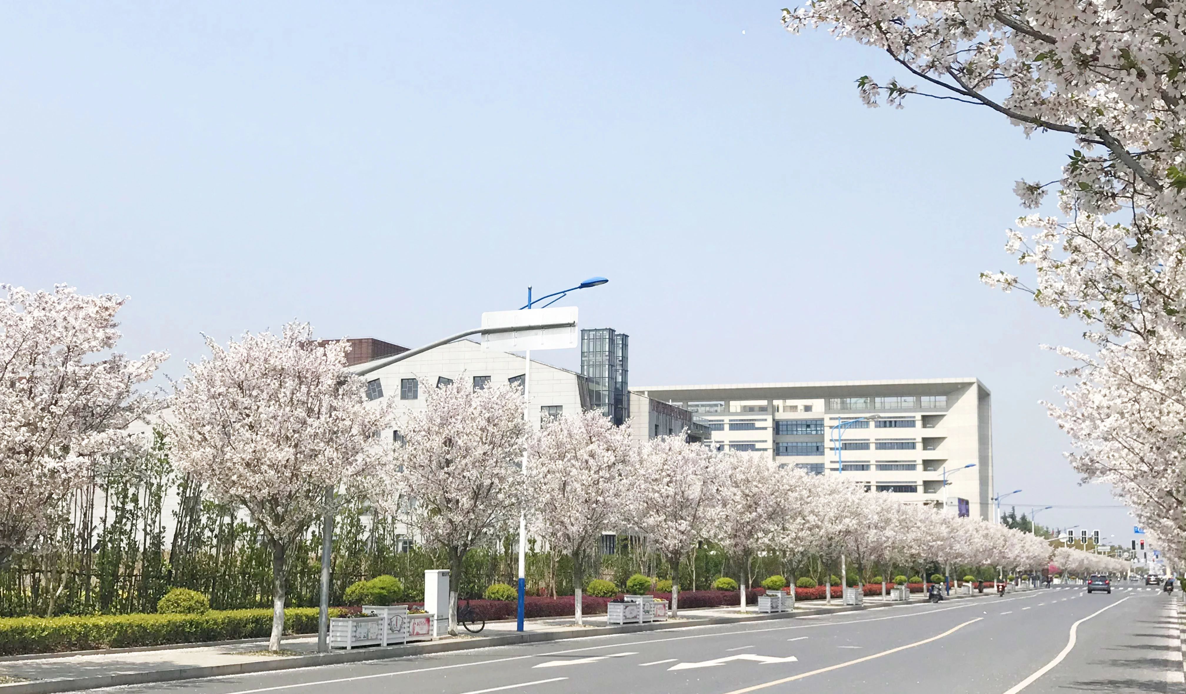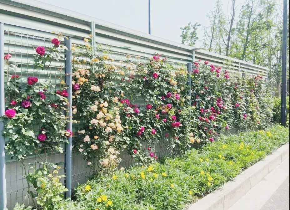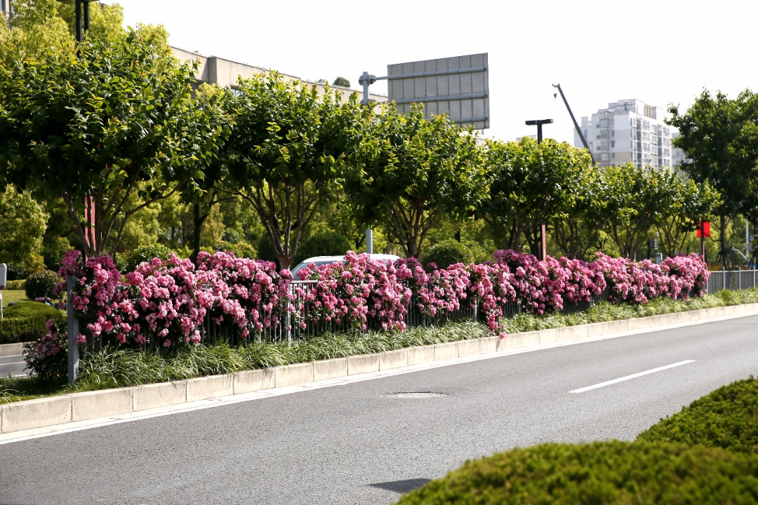 江月路为双向四车道,长650米,行道树为香樟,中分带种植樱花、中层紫薇,隔离护栏种植藤本月季,形成春夏季繁花似锦的特色景观道路。