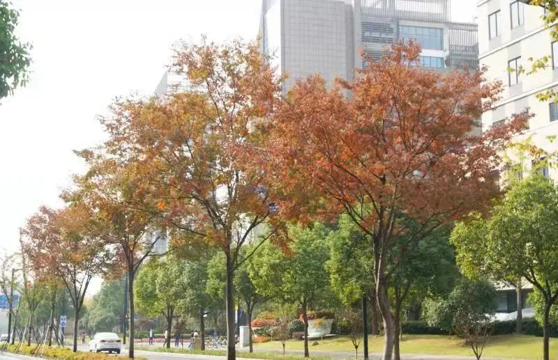 海伦路为双向六车道,长500米,行道树为北美枫香,部分段采用连接带形式,搭配种植萱草等不同植物,与机非隔离带种植的帚桃,营造出两季有花、一季有色的特色道路景观。