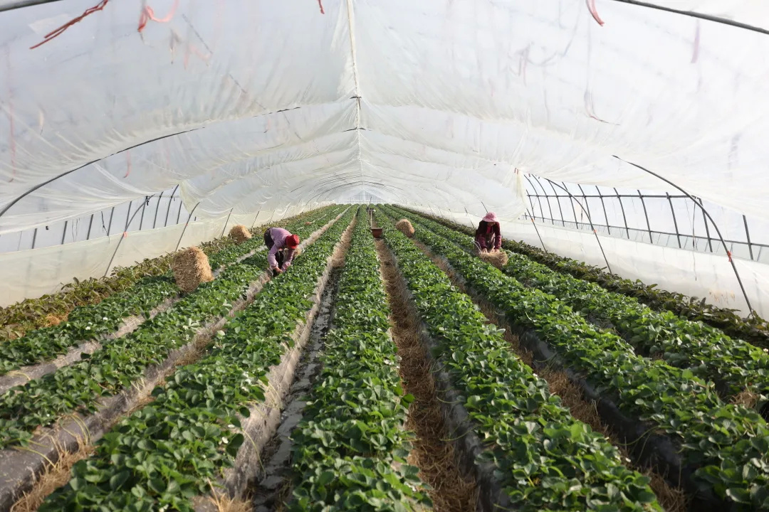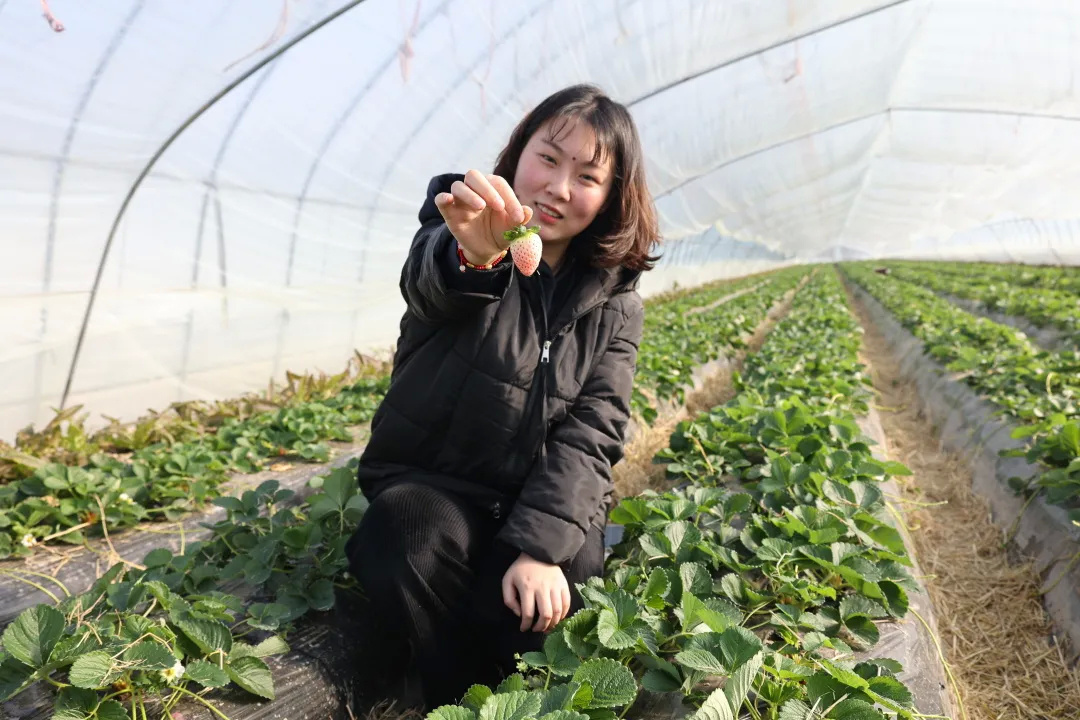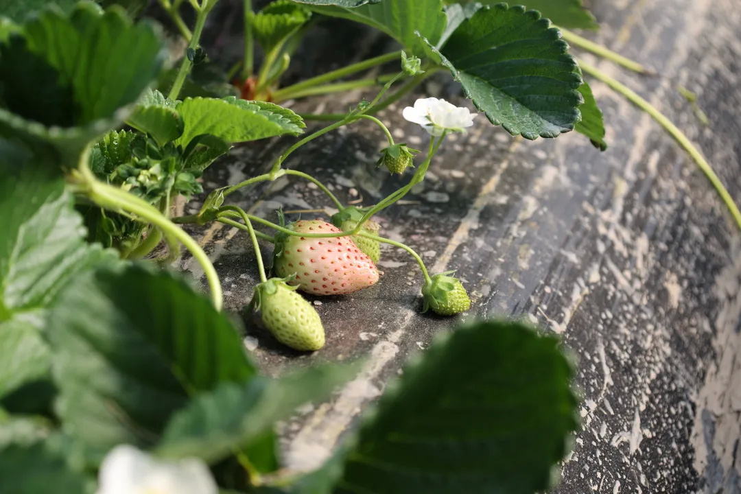 走进草莓种植大棚,一股清甜的香气迎面而来、沁人心脾。放眼望去,只见翠绿植株之上,一个个粉白色的草莓在绿叶和白花间不时探出了头,粉嫩的颜色惹人喜爱。