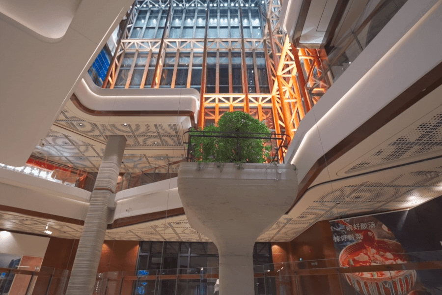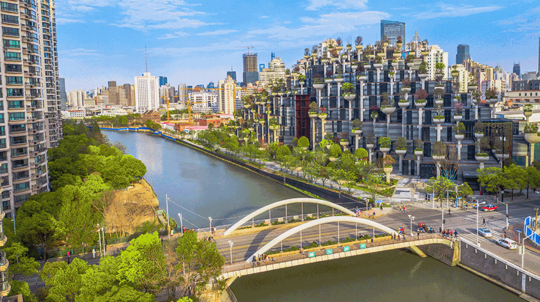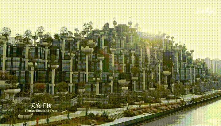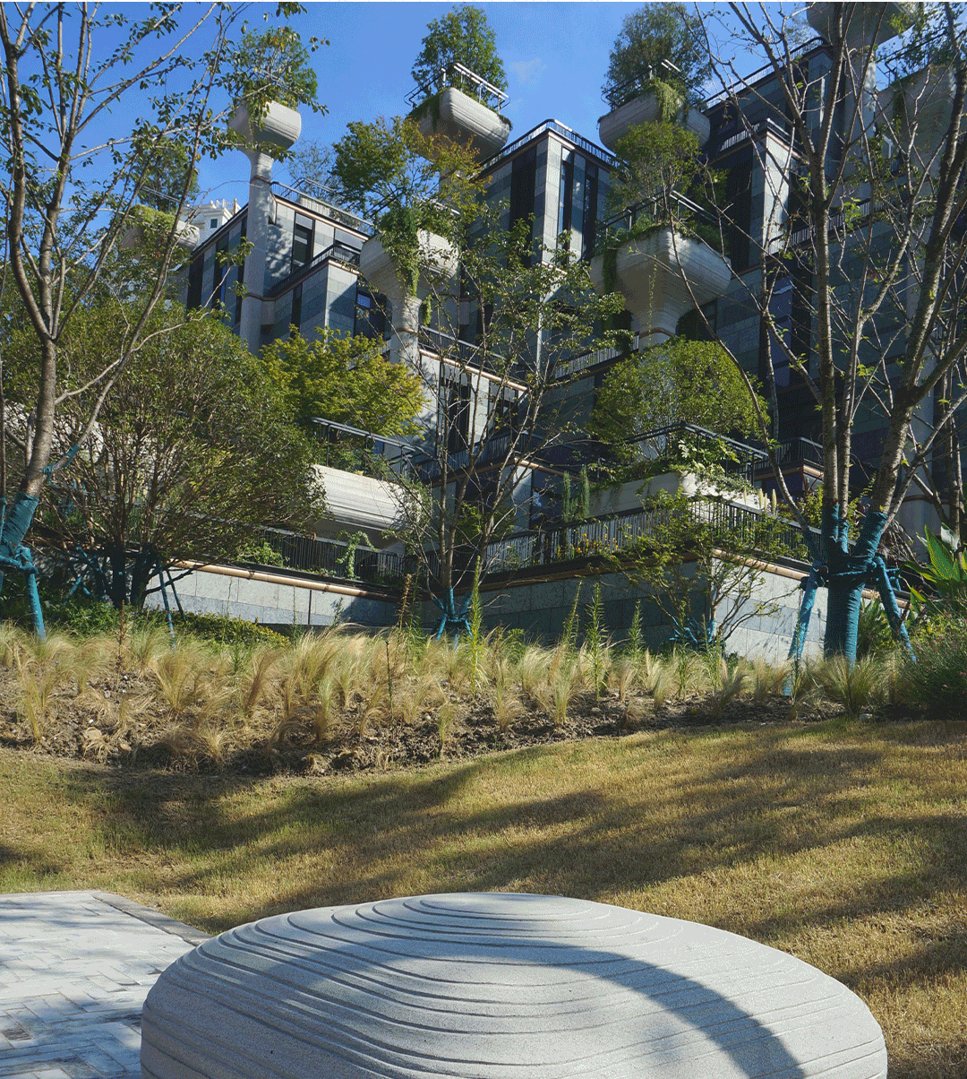 整个建筑以黄山为灵感,借用起伏流畅的山势勾勒建筑群的轮廓,形成一座绿荫环绕的山丘。流线游走的小径、高低错落的绿植、开放式露台……模糊了建筑、花园和景观之间的界限,山水相融间,举目皆是自然美景。