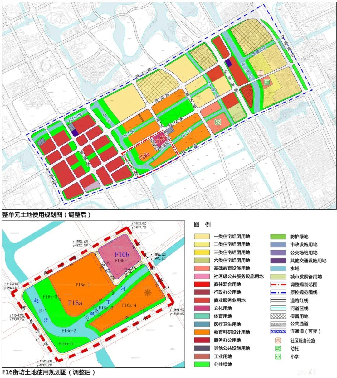 增加城市支路,形成F16a、F16b两个街坊。F16a街坊内地块延续原规划,为教育科研设计用地,F16b街坊内地块调整为文化用地。