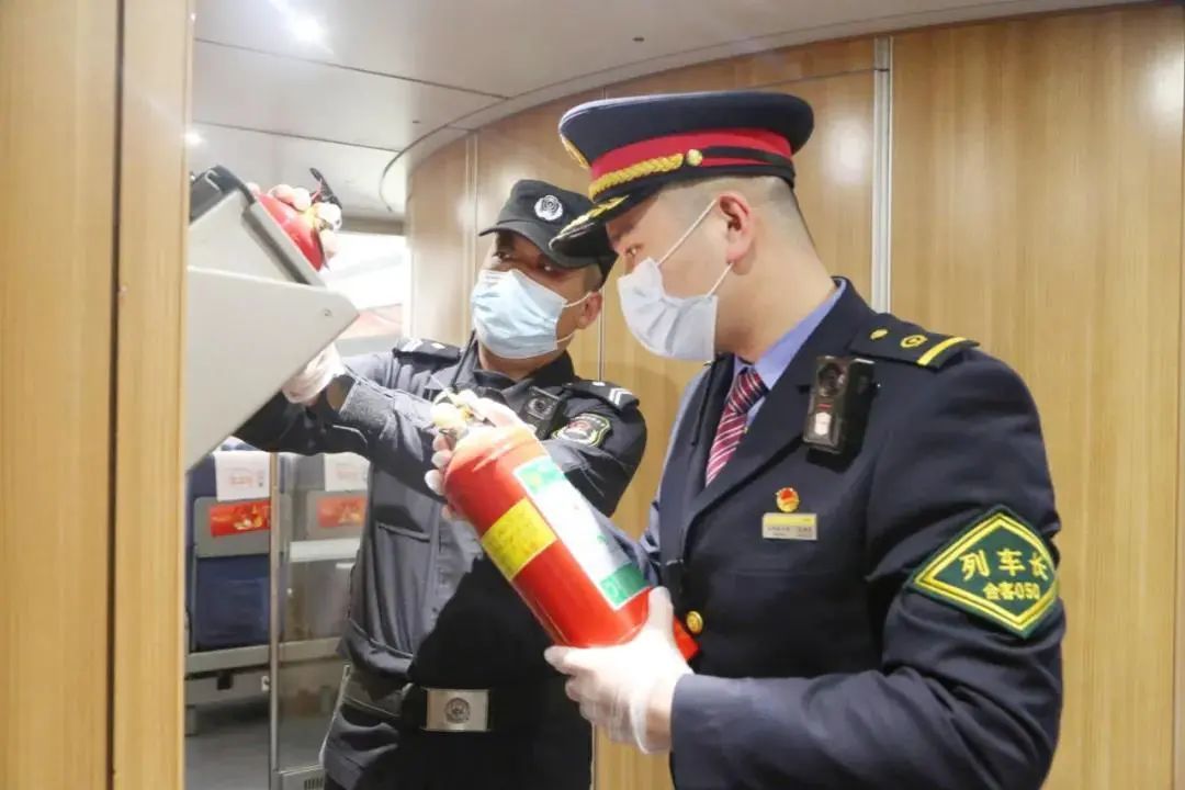 列车的每节车厢都配备有灭火器,分为水基型灭火器和干粉灭火器两种。水基型灭火器适用于扑救易燃固体或非水溶性液体的初起火灾。干粉灭火器可扑灭一般火灾,还可用于可燃气体和电器设备的初期火灾。