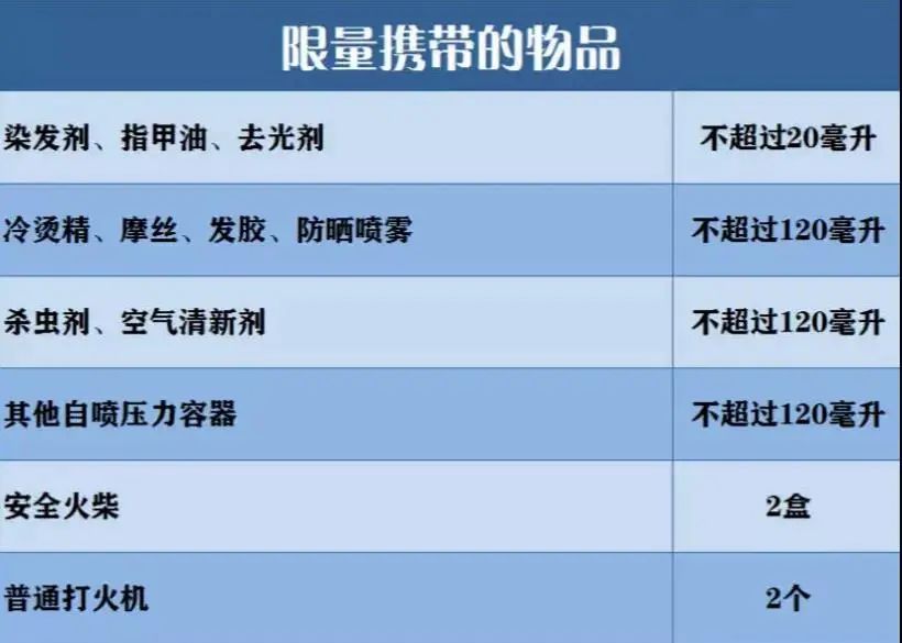 因为这些物品内部所含溶剂均为可燃或易燃成分,一旦泄漏,就有发生火灾的风险。所以除了不能携带易燃易爆的危险品之外,防晒喷雾等压力容器要看清楚是否超过120毫升。