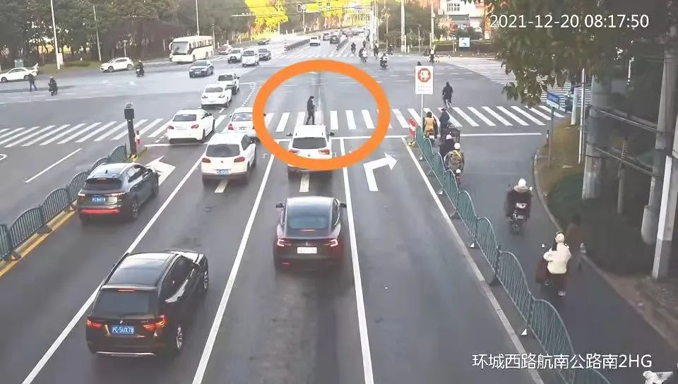 今天早上8:15左右,正值早高峰,奉贤南桥城区车流汹涌,人流如织。在环城西路航南公路路口东北角,奉贤交警支队一大队辅警何冬俊正在执勤时发现突然发现一名阿姨由西向东横穿马路,完全 无视红灯 。