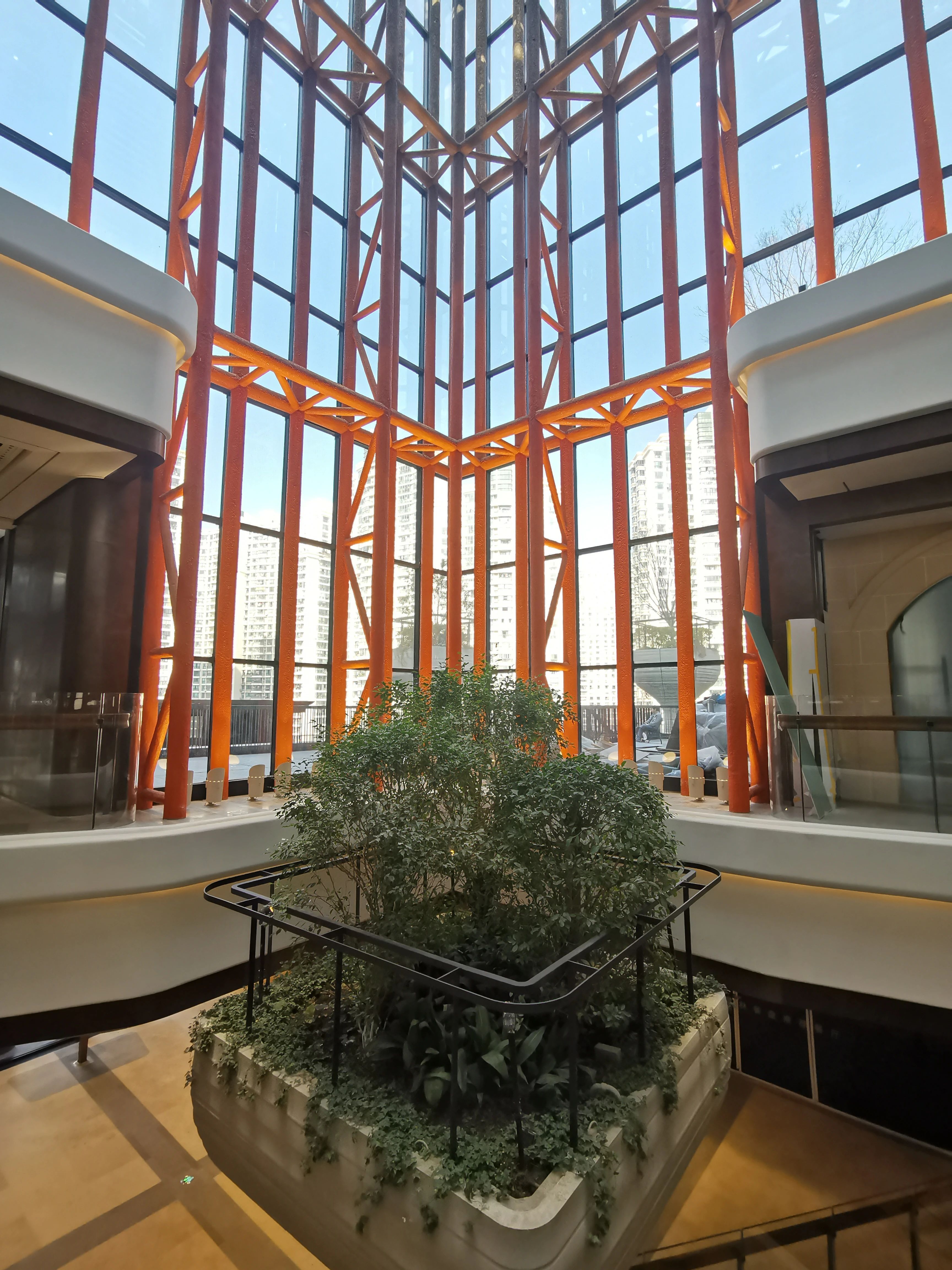 空中的草木如何生长?奥秘就在平台下方一根根的方形结构列柱中,一次性成型的结构列柱是空中花园的生命柱,也是建筑的生命力。结构列柱连接地下一层、地上九层的空间,顶端伸出天花板。结构列柱中最高的达60余米,柱内预埋给水管、雨水排水管,并装有雨量传感器、土壤水分传感器等,针对不同树种的生长习性设定感应数值,根据土壤湿度自动调节浇洒量,实现智能自动灌溉。此外,树木根据抗风性、落叶性,错落有致地进行种植。最上层的树木抗风性好,落叶少,四季常绿,最下层的树木抗风性相对差点,可以营造落叶的美景。绿植覆盖,不仅能够缓解温室效应、减少噪音、灰尘、净化空气等,还可以改善周边生态环境,并有节能的效果。