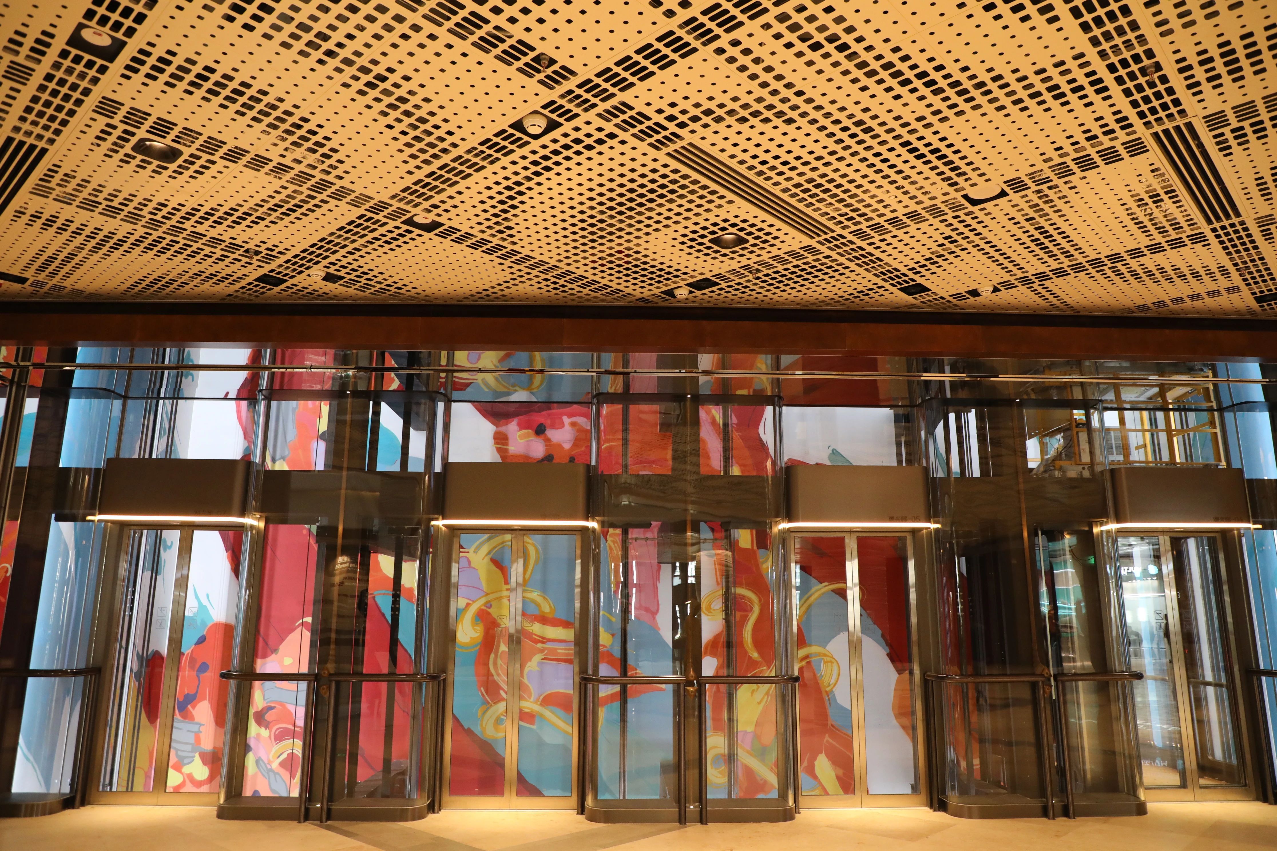 而在商场内部,三位当代艺术家创作的《鲲鹏》《天井》《成长》,则以巨型画幅的形式,陈列在艺术电梯井后方,让市民在电梯升降间,亦可感受艺术的氛围。