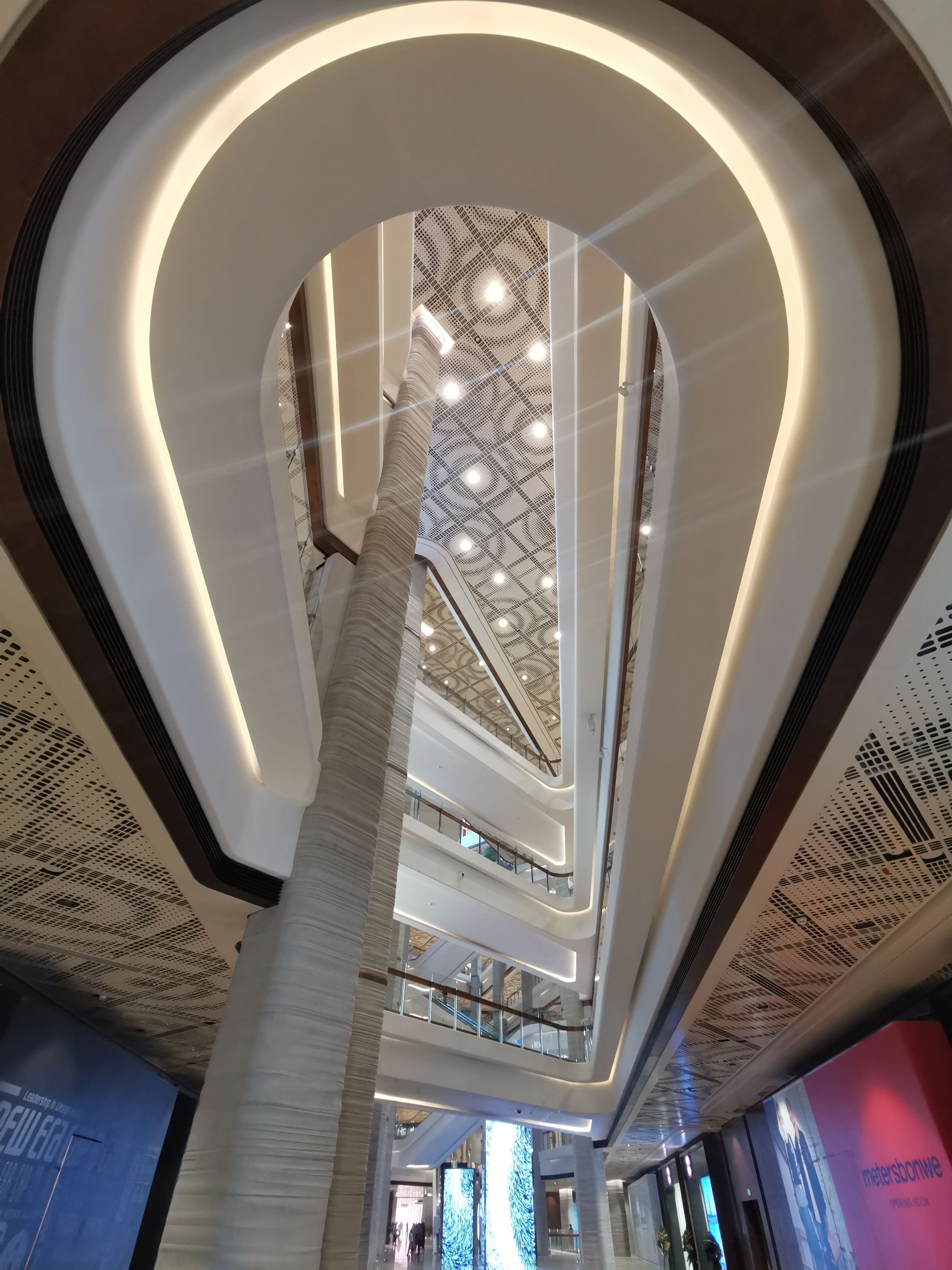 走进商场内部,数百根清水混凝土立柱从空中悬垂直下,仿佛扎入大地的巨根,而纵贯楼梯的采光天井保证了整个商场的明亮通透,与外部的雄伟壮观相比,内部更具典雅和堂皇。