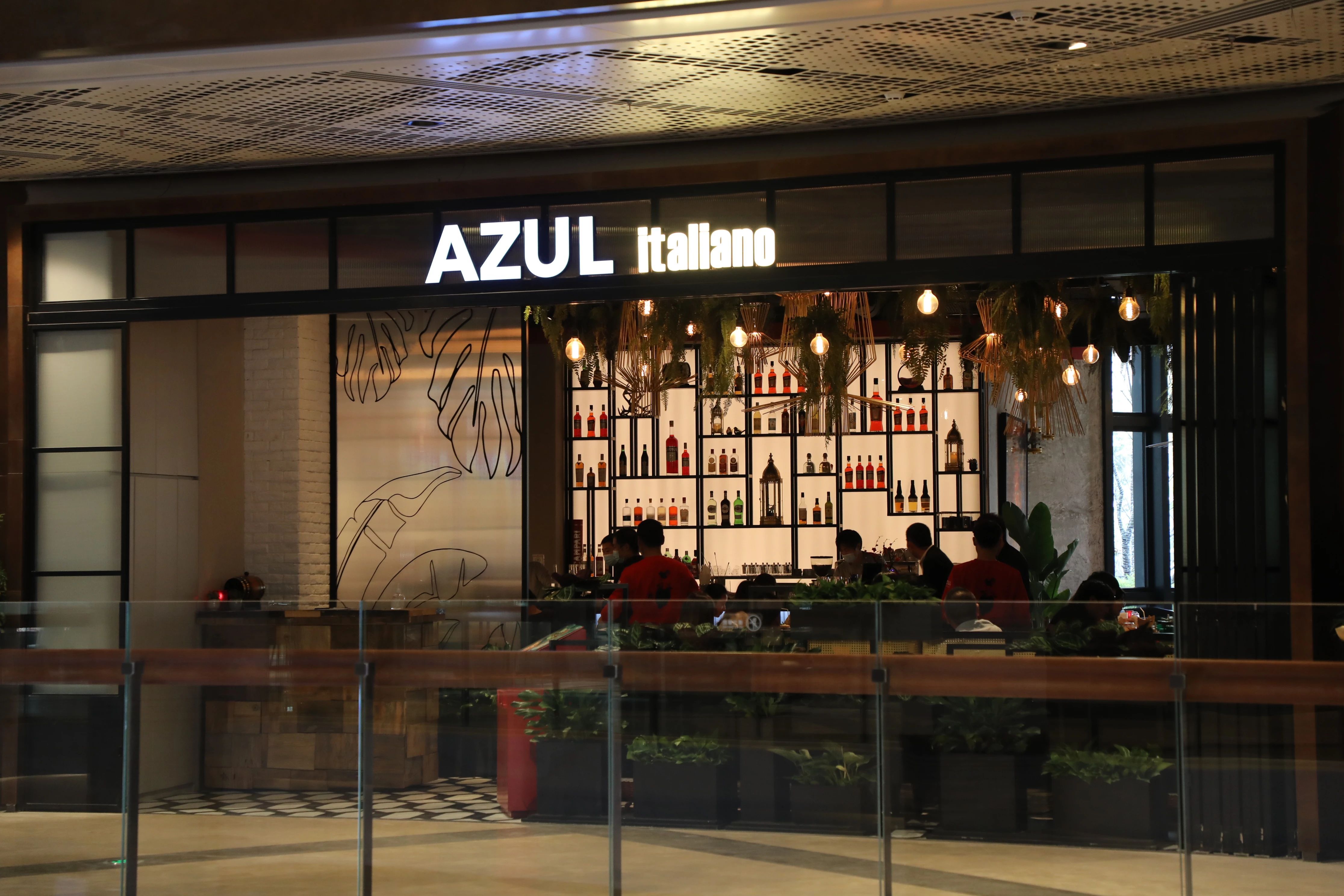 资深网红餐厅AZUL在天安千树打造了缤纷多彩的高挑空间,营造摩登休闲的就餐氛围,标志性的蓝色logo、墙面巨幅彩绘和奶油色的复古小摩托,诠释着浪漫的意式情调。