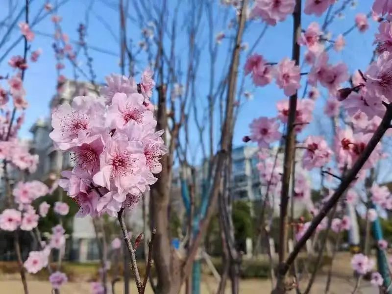 美人梅是红叶李与重瓣宫粉梅的杂交品种,也是最迟开花的梅花品种,花期一般在15—20天。