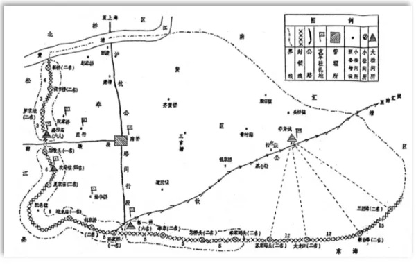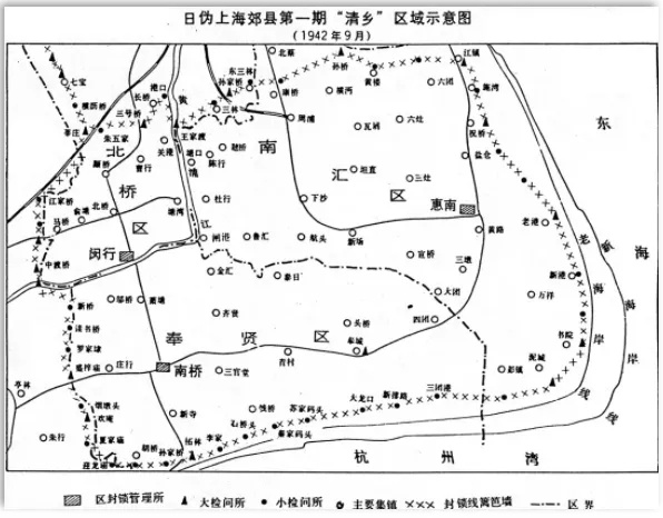 当时,伪上海清乡分会对南汇、奉贤、北桥开始第一期清乡。改区公署为特别区公署,各自设立封锁管理所,开设保甲人员封锁训练班,实行调查户口,编组保甲。在清乡区四周修筑竹篱笆封锁线167公里,对重要出入通道配置大检问所19个,次要通道通道设置小检问所数十个。1943年5月1日,除继续对南汇、奉贤、北桥实施清乡外,又在崇明、宝山、嘉定三县进行清乡,修筑封锁线221公里。同年12月1日,清乡地区为川沙、浦东南、浦东北区域,并成立伪第三期清乡指挥部,修筑封锁线56公里。