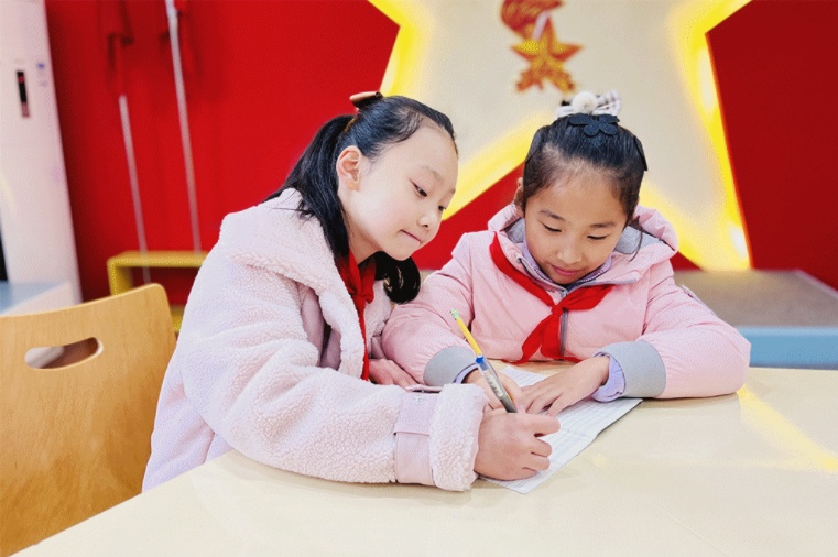 下午4:30,宝山区美罗家园第一小学的校园里,孩子们正在参加课后服务活动。学校提供了丰富多彩的课后服务项目。有的孩子来到红色长廊,学党史讲党史,这些“宣讲小先生”拿出手掌大小的纸,认真写下党史故事宣讲稿。