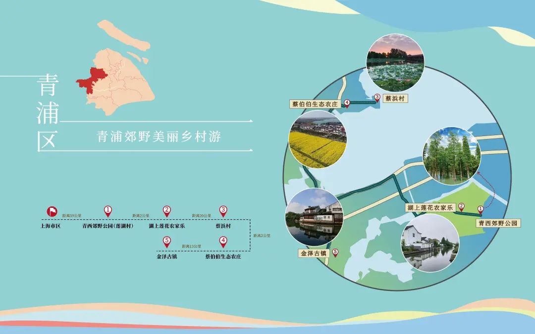 线路:青西郊野公园(莲湖村)→湖上莲花农家乐→蔡浜村→蔡伯伯生态农庄→金泽古镇