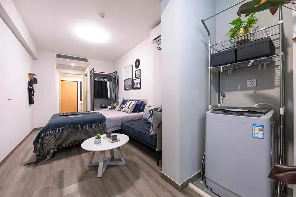在房间里,空调、热水器、洗衣机等一应俱全,同时,因为配备了衣帽柜和床等基本家具,整个房间基本达到了拎包入住的便利程度。