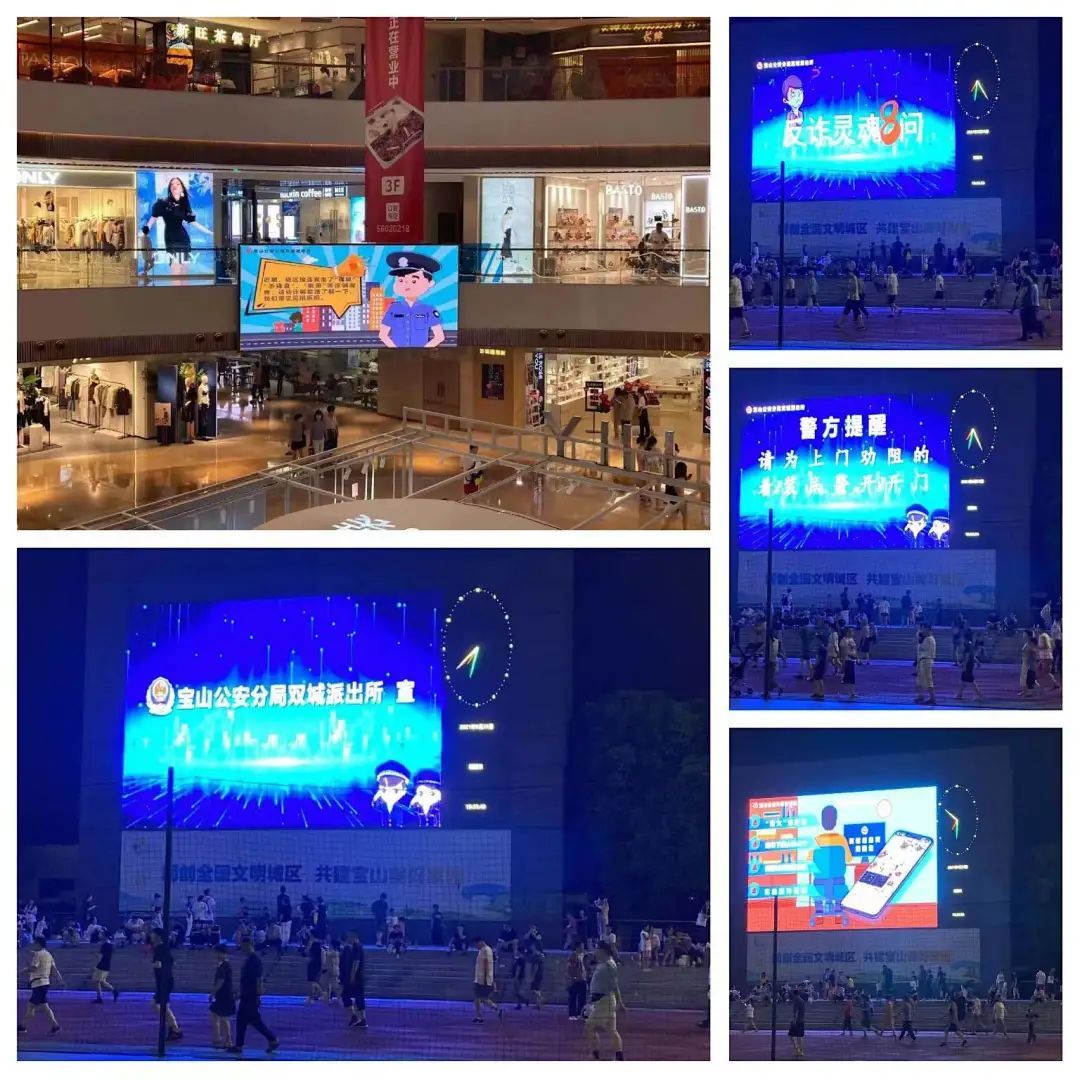 在传统入户走访的基础上,双城派出所充分借助辖区大屏资源,将精心制作的反诈知识宣传视频、“国家反诈中心APP”推广视频在宝山体育场、宝龙广场、宝山图书馆等人员密集场所的大屏上进行展播,使辖区群众直观了解到新型诈骗套路,掌握防范知识,营造起“全民反诈”的浓厚氛围。