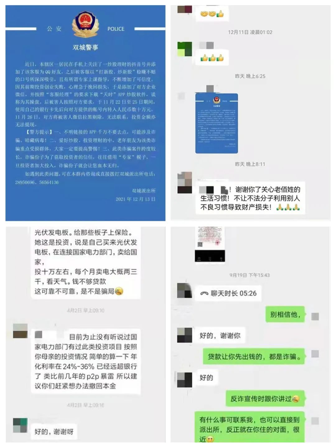 深化反诈微信圈群等“线上”防范举措,针对当下 “刷单”“裸聊”“杀猪盘”等常见诈骗套路,深入剖析作案手法与防范要领,定期向辖区居民推送“双城警事”等防范推文,在线开展反诈咨询解答,防骗劝阻等举措,推动形成“在线互动、快速响应、有效劝阻”的反诈防骗新模式。