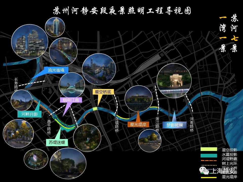 静安区苏州河两岸整体灯光规划,包括北岸远景路-河南中路桥共4.7公里,南岸安远路-成都北路共1.6公里,设计主题为“光䨒苏河,水岸静安”,以“人脉、绿脉、文脉”三条线路,通过对周边建筑、滨水步道、滨水绿化及堤岸的夜景打造,营造温馨雅致宜居的夜间生活环境,促进苏州河两岸水岸文化、海派文化、工业文化、红色文化交汇共生。