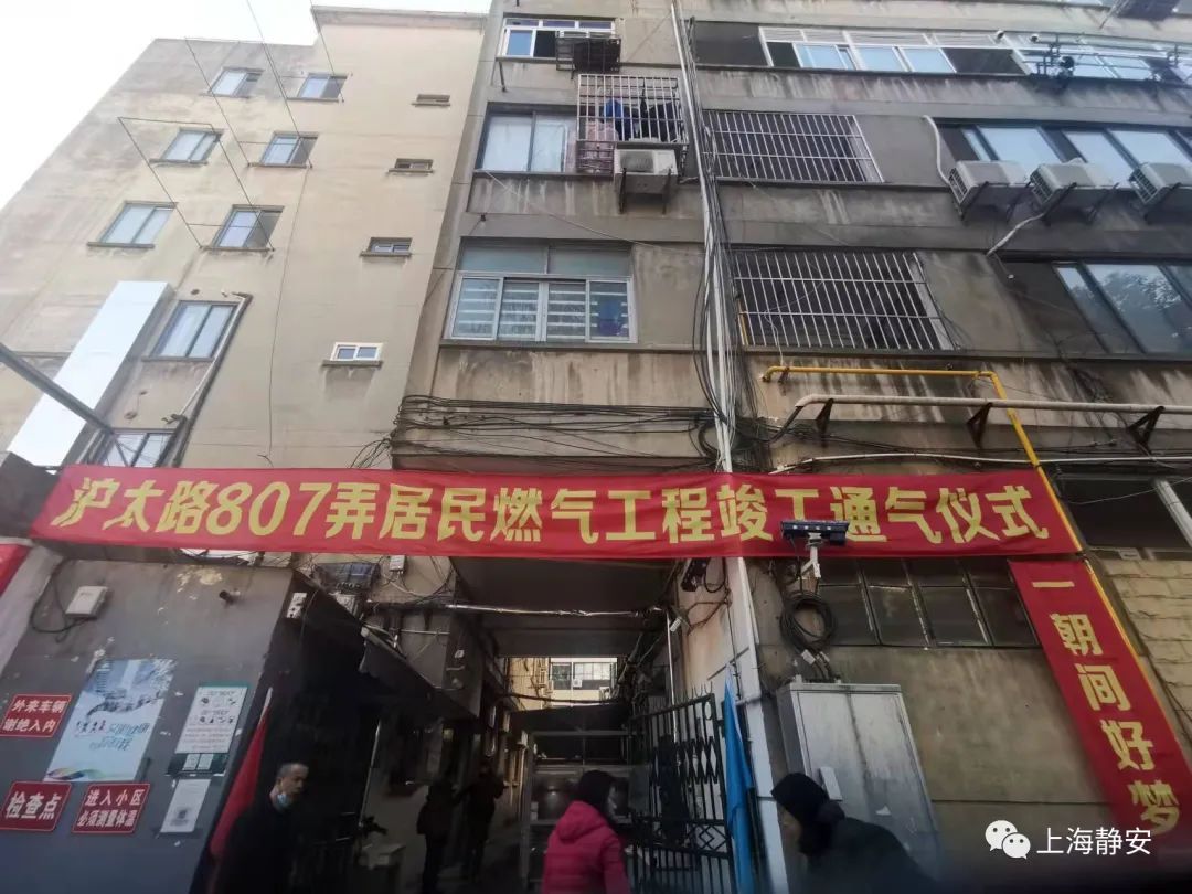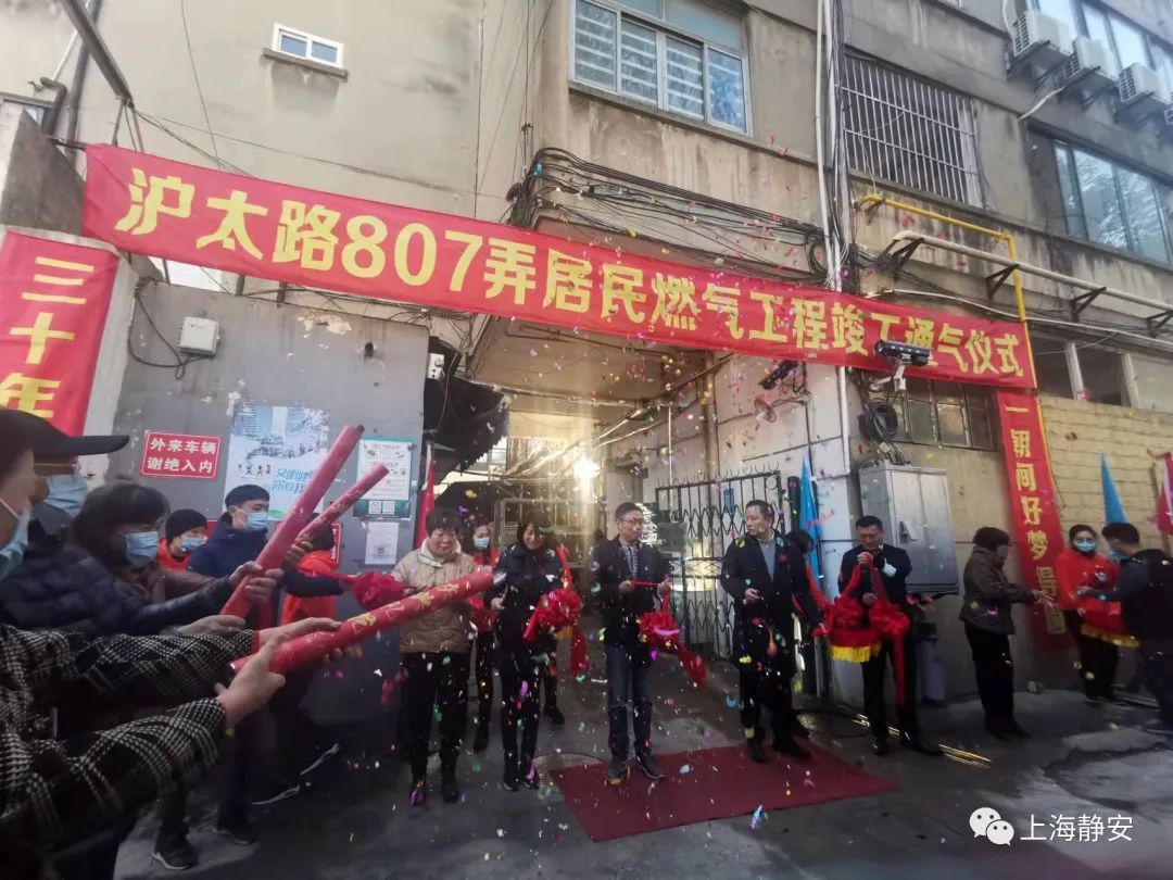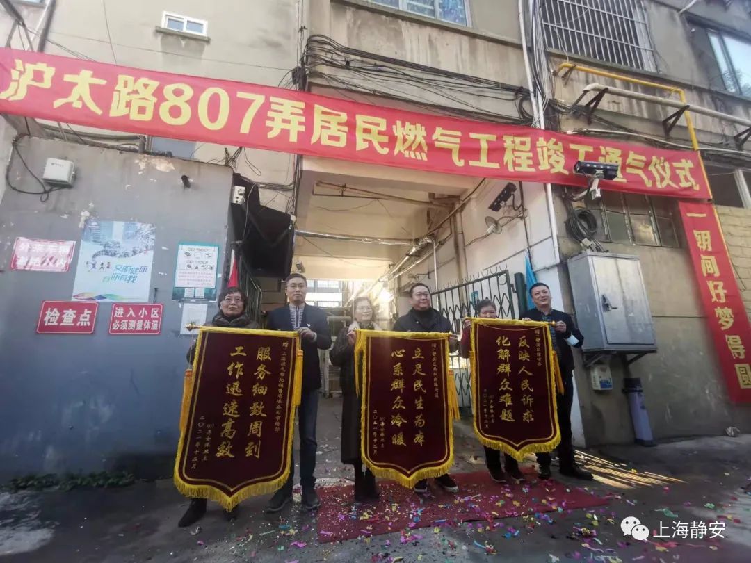 在沪太路807弄1号楼下,居民们买来礼花筒欢庆这个燃气启用的喜庆时刻,并向相关部门赠送锦旗,感谢之情溢于言表。