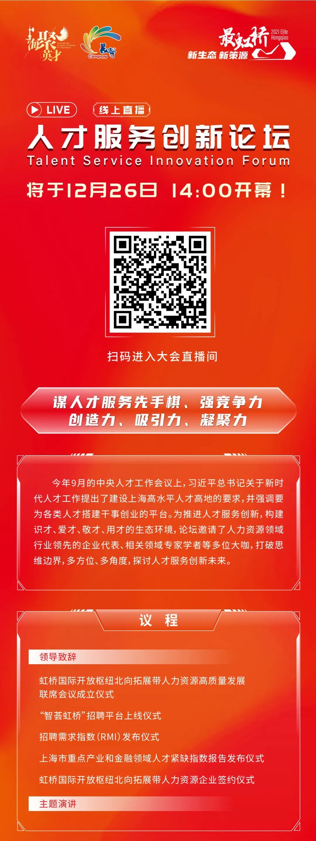 长宁区和上海人才服务行业协会共同举办的2021年市“海聚英才”系列活动——人才服务创新论坛将于12月26日14:00在线上开幕。届时,“智荟虹桥”招聘平台将正式上线,活动还将发布招聘需求指数(RMI)和上海市重点领域产业和金融领域人才紧缺指数报告。