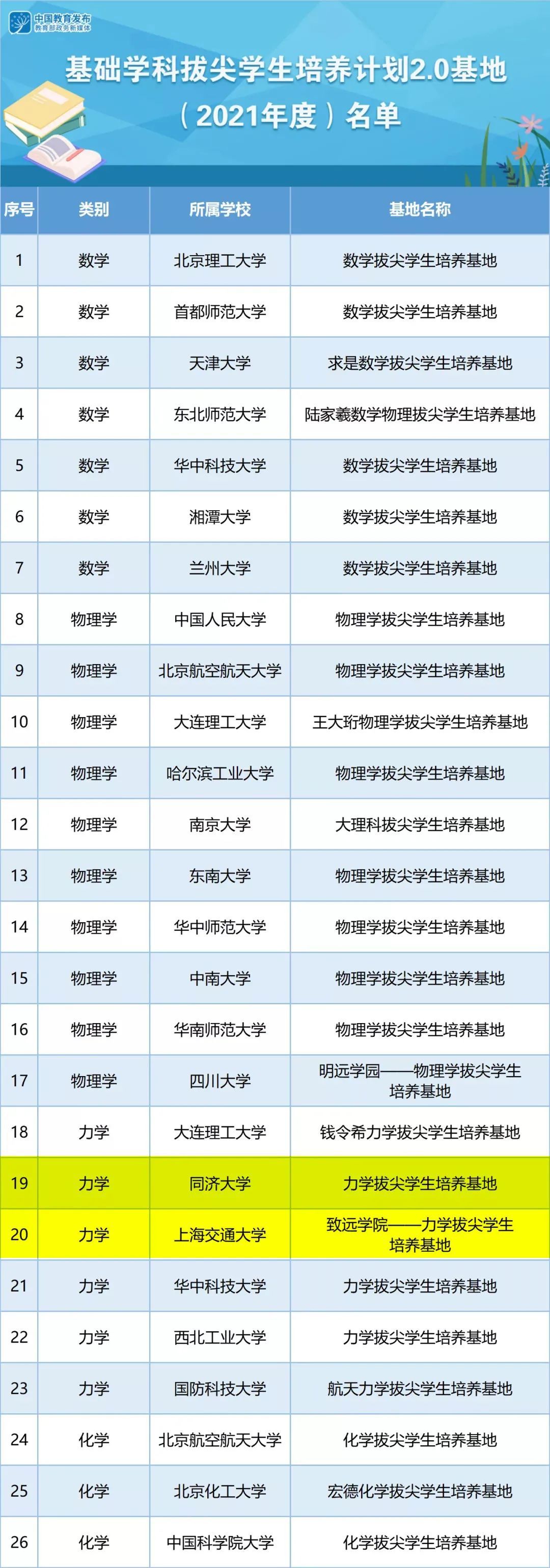 基础学科拔尖学生培养计划2.0基地(2021年度)名单