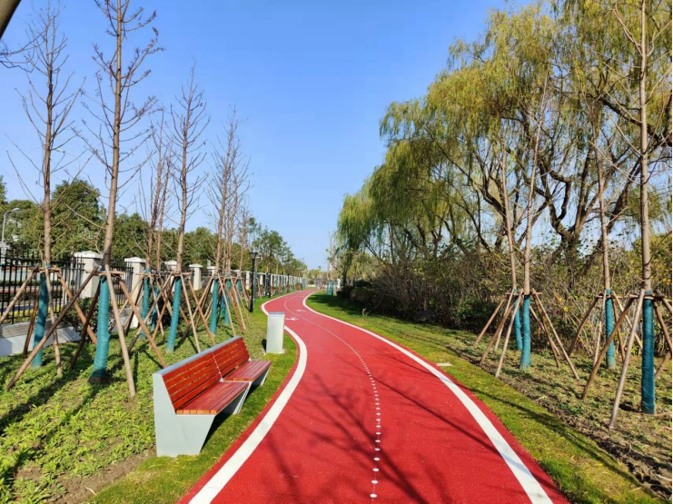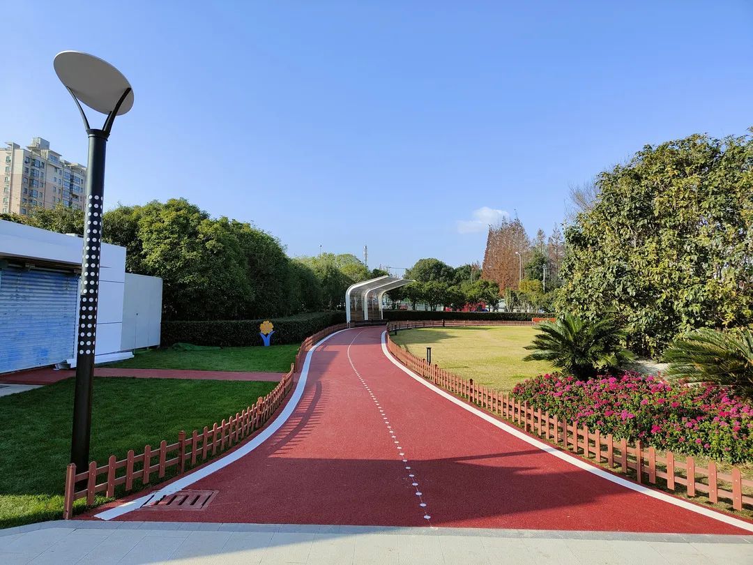 红色健身步道搭配绿草鲜花,