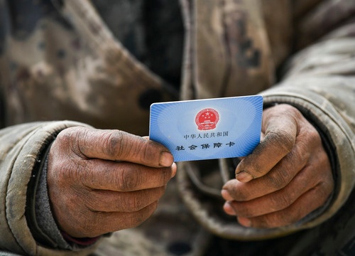 在新疆叶城县西合休乡亚尔阿格孜村的卫生室,一名村民手持社保卡等候登记体检信息。新华社记者 胡虎虎 摄