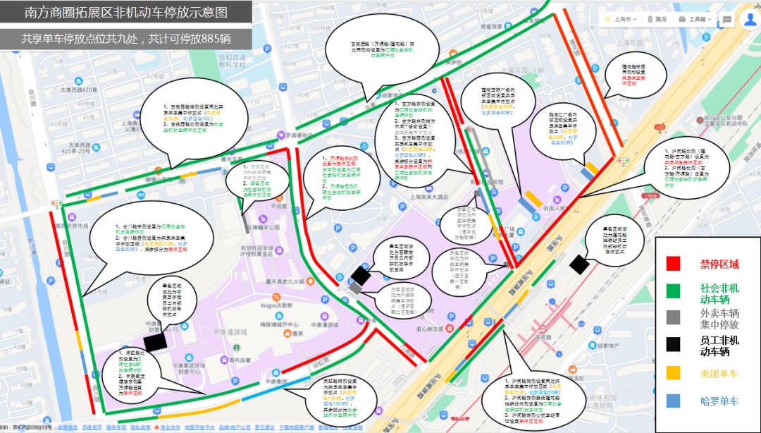 城运中心俞敬礼指着停车图举了一个例子,中庚漫游城南侧的闵虹路,一到用餐高峰时段,外卖小哥就会扎堆停放在商场的主要出入口,影响行人通行。为了还路于民,也为了保持商场主要出入口的美观有序,经过与商场的沟通,建议引导外卖车辆停放到商场后街的通道,并加强管理力量,这样既能方便外卖小哥进出商场取餐,停车秩序也有保障。
