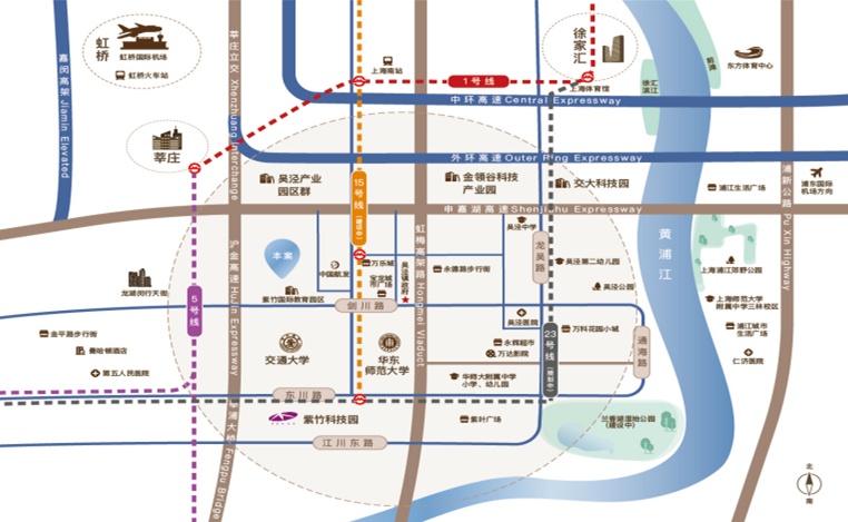 租赁社区位于吴泾镇市级主干道龙吴路沿线,距轨交15号线紫竹高新区站约2.5公里,预计10分钟内步行能到达规划23号线紫龙路站(暂定名)。选择自驾的朋友可通过申嘉湖高速联通嘉闵高架、虹梅路高架等,45分钟左右达虹桥商务区,1小时左右到达徐家汇。社区周边还有公交956路、闵行26路和闵行41路站点,出行便捷。