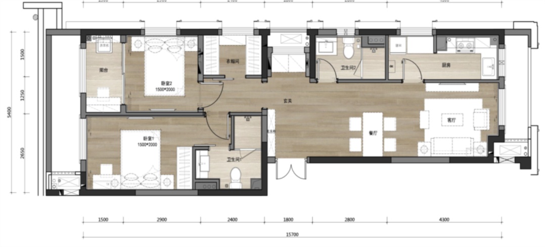 建面约100㎡的两室一厅两卫户型图