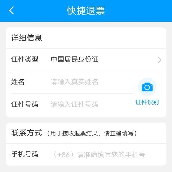 1、打开快捷退票,填写身份信息、联系方式并完成人证核验。外国人永久居留证和外国护照两种证件类型,暂不支持人证核验。