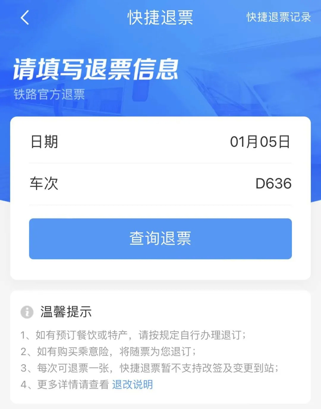 温馨提示:快捷退票不仅可以通过铁路12306APP办理,支付宝小程序中也可以操作哦~