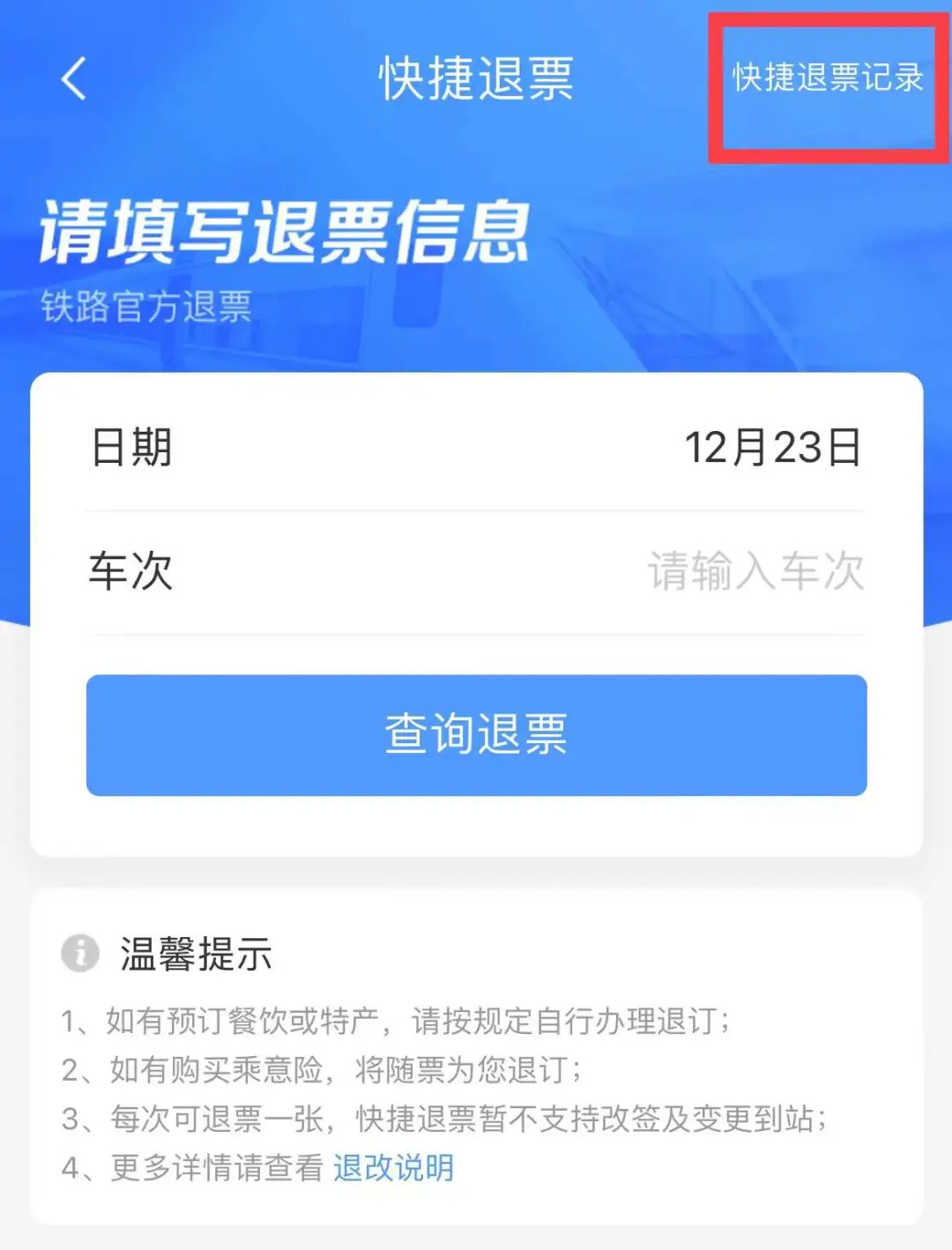 3、打开快捷退票页面,点右上角“快捷退票记录”,即可查询通过快捷退票办理业务的退票记录。
