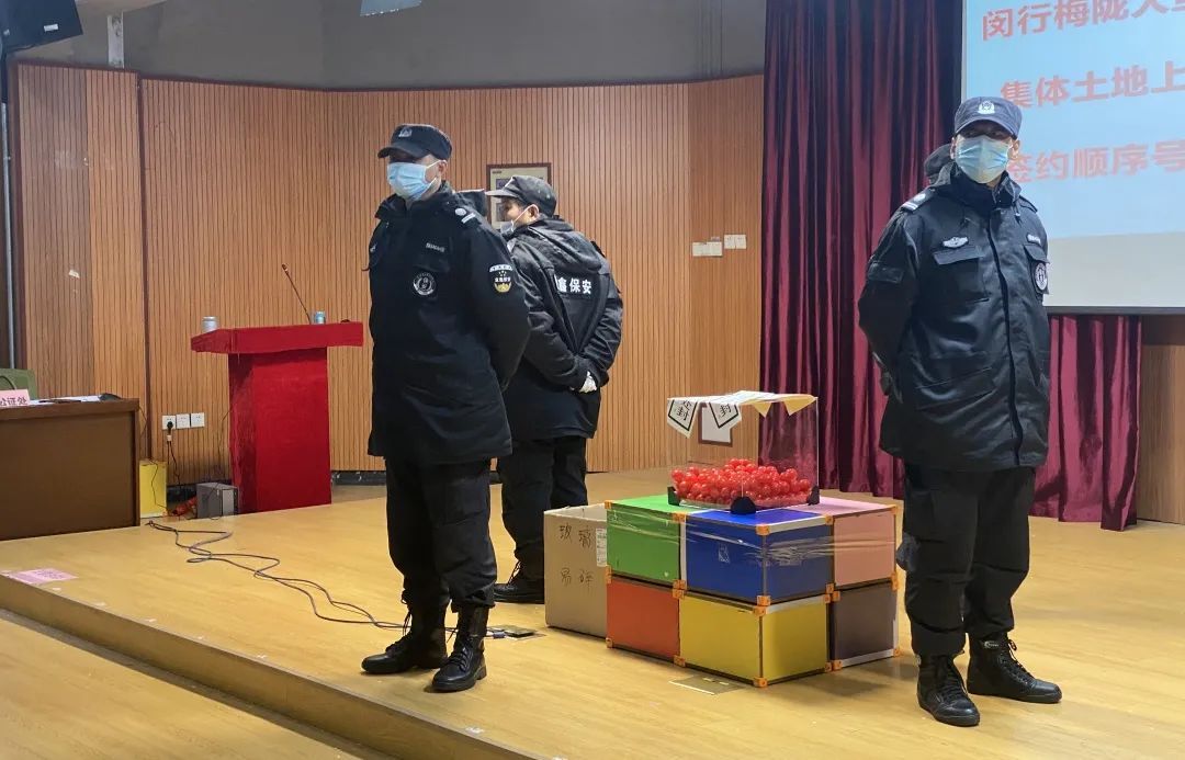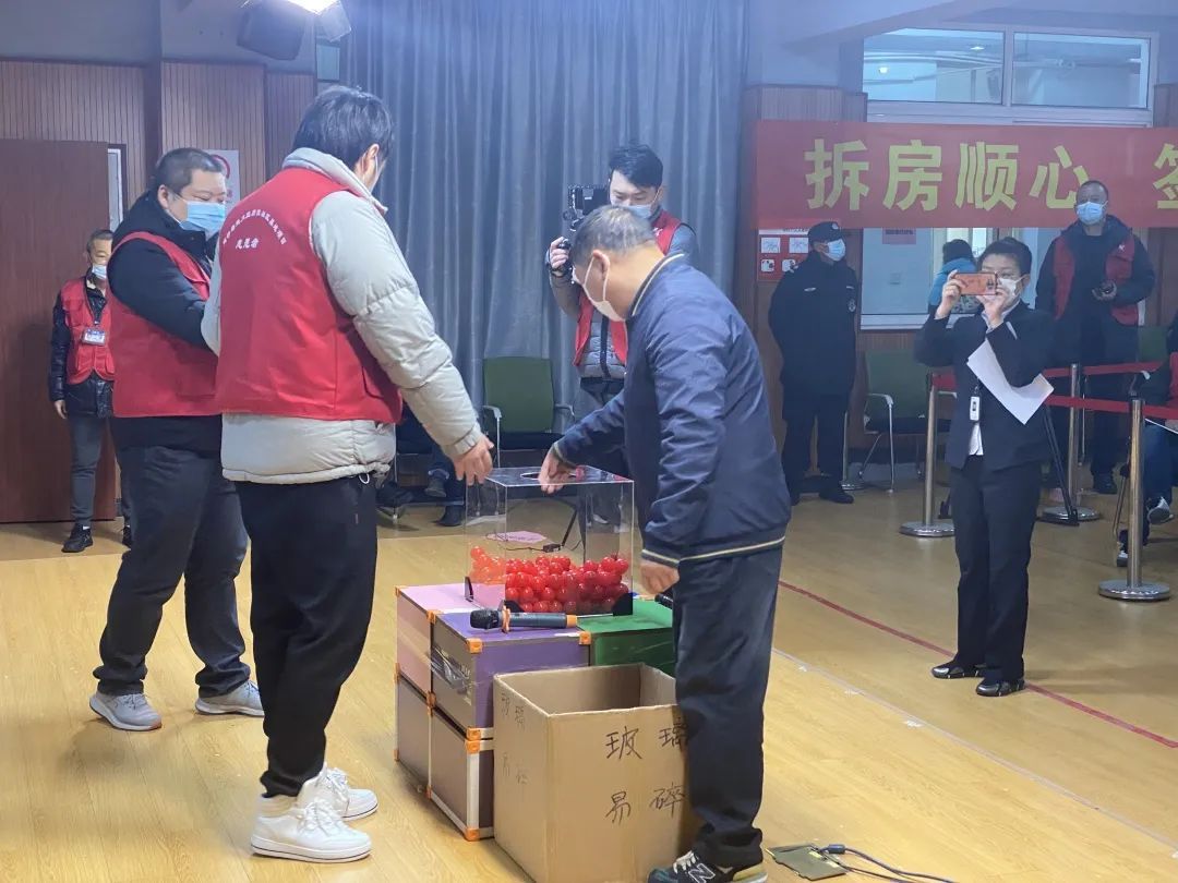 12月25日上午8:00闵行梅陇大型居住社区基地项目集体土地上居住房屋补偿选房签约顺序号现场抽取工作正式开始!依照疫情防控工作有关要求,本次抽签共5批,当日全部完成。在公证人员的监督下,工作人员将选房签约顺序号装入封号球内,并将230个封球全部放入透明的抽签箱中。