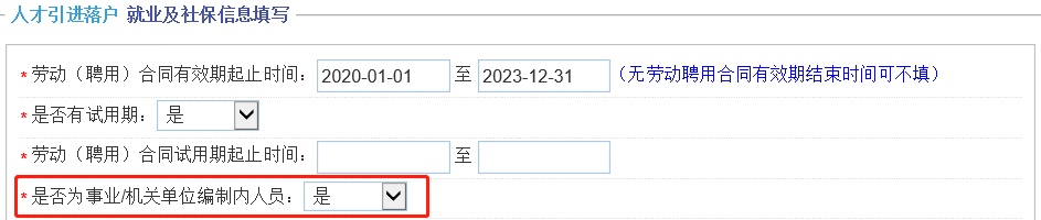 按照实际情况填写就业及社保信息,合同有效期起止时间、试用期时间与签订的劳动(聘用)合同时间一致。如果申请人是事业/机关单位在编人员,这里请选择“是”。