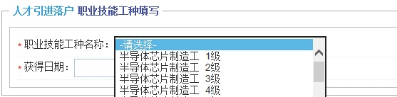 技能类人才按照系统提示选择申请人所获得的职业技能工种名称,并填写获得日期。