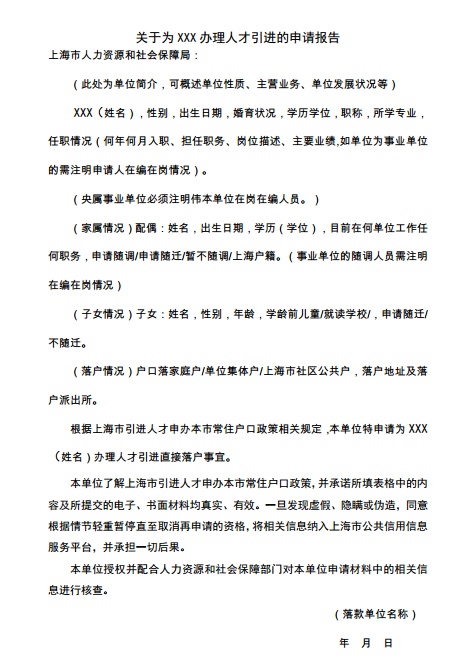 申请报告公函应严格按照系统中的样张模板填写,内容包括单位简介,申请人、配偶及子女情况介绍,落户情况,承诺授权,落款单位名称和时间,不可简化或漏写。另外提醒大家,事业单位的调动人员需在申请报告公函中注明在编在岗情况。