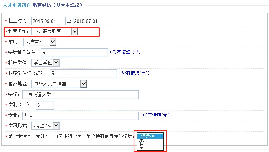 若主申请人最高学历为非普通高等教育专科起点的本科学历,“是否专转本、专升本、自考本科学历,是否持有前置专科学历”一项选择“是”,然后按照系统要求填写前置学历信息。