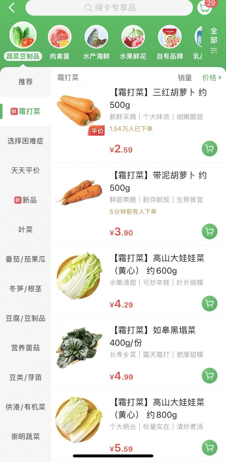 记者在“叮咚买菜”app上看到,一些日常消费量大的蔬菜,价格较为平稳且供应充足:霜打胡萝卜2.59元一斤,霜打娃娃菜4.29元一颗,霜打松花菜6.25元一斤……