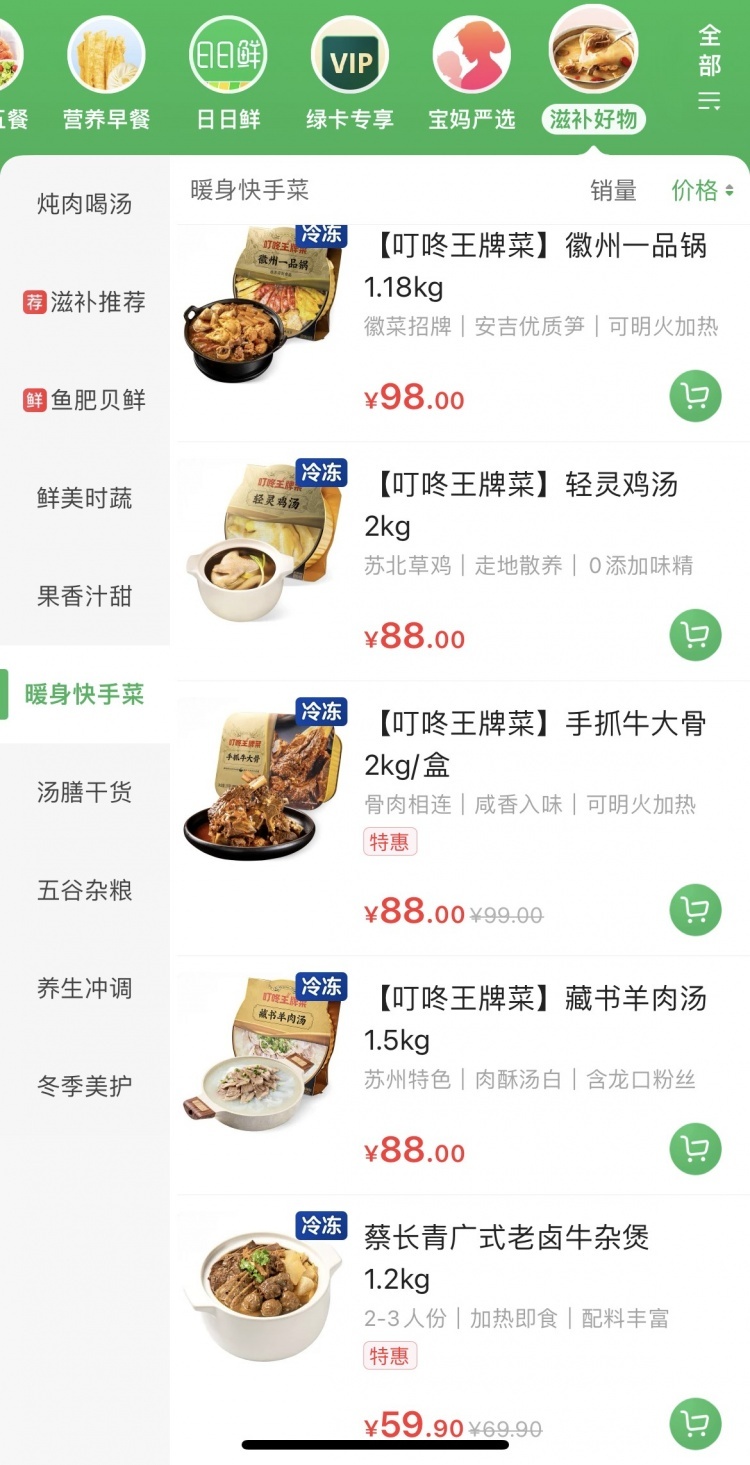 同时,叮咚买菜还专门推出了“暖身快手菜”系列,包括藏书羊肉汤、松茸鲍汁捞、广式老卤牛杂煲、轻灵鸡汤、手抓牛大骨等快手菜,消费者在家简单加热10分钟,就能品尝到这些暖胃滋补的菜品。这类方便快捷的快手菜商品也非常受欢迎,随着气温骤降,上周末的销量环比增长超过300%。