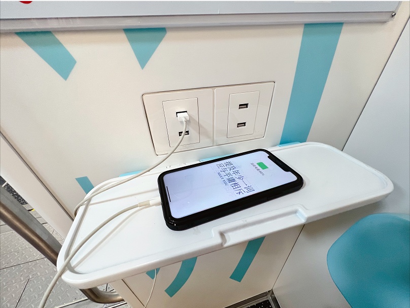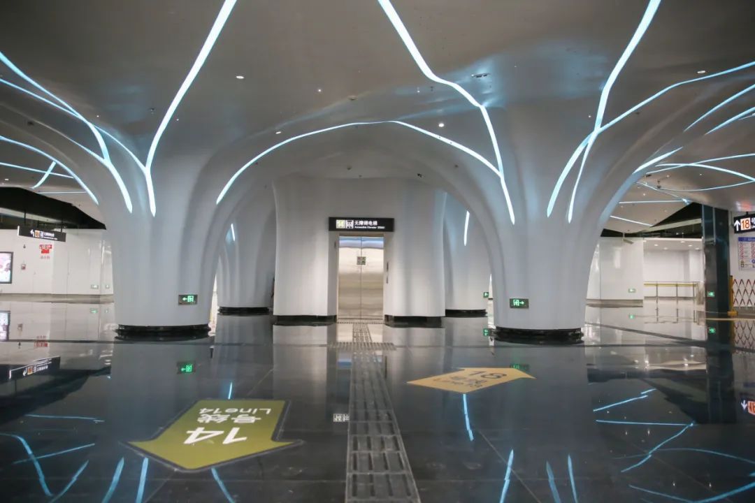出行无障碍:除了设置第三卫生间之外,无障碍设施之一的无障碍电梯容量由标准1吨型号提高为1.35吨型号(蓝天路站付费区由9号线代建共享电梯除外)。内部空间和载客人数增大1/3,可满足两辆轮椅车同时乘坐,提高运行效率。