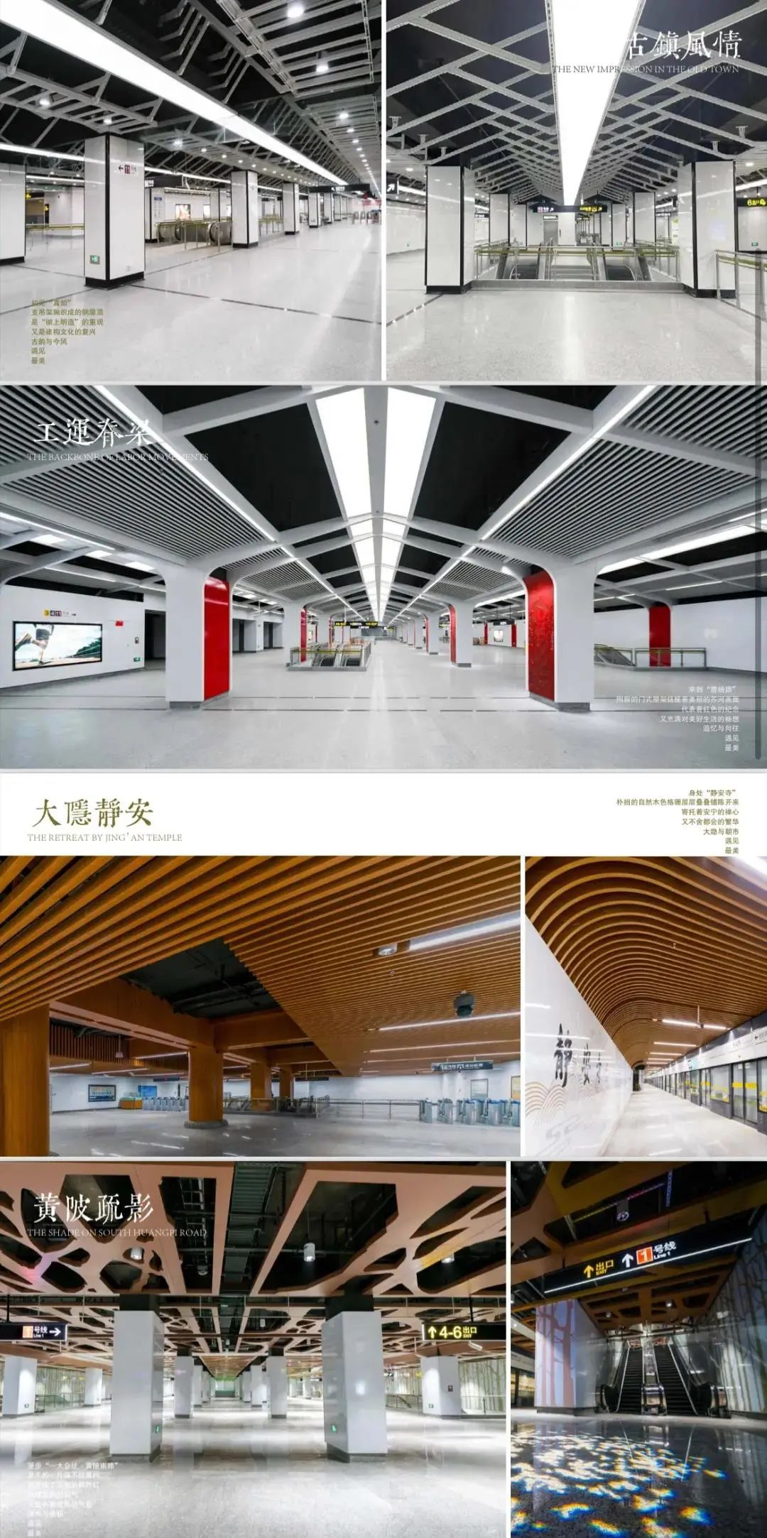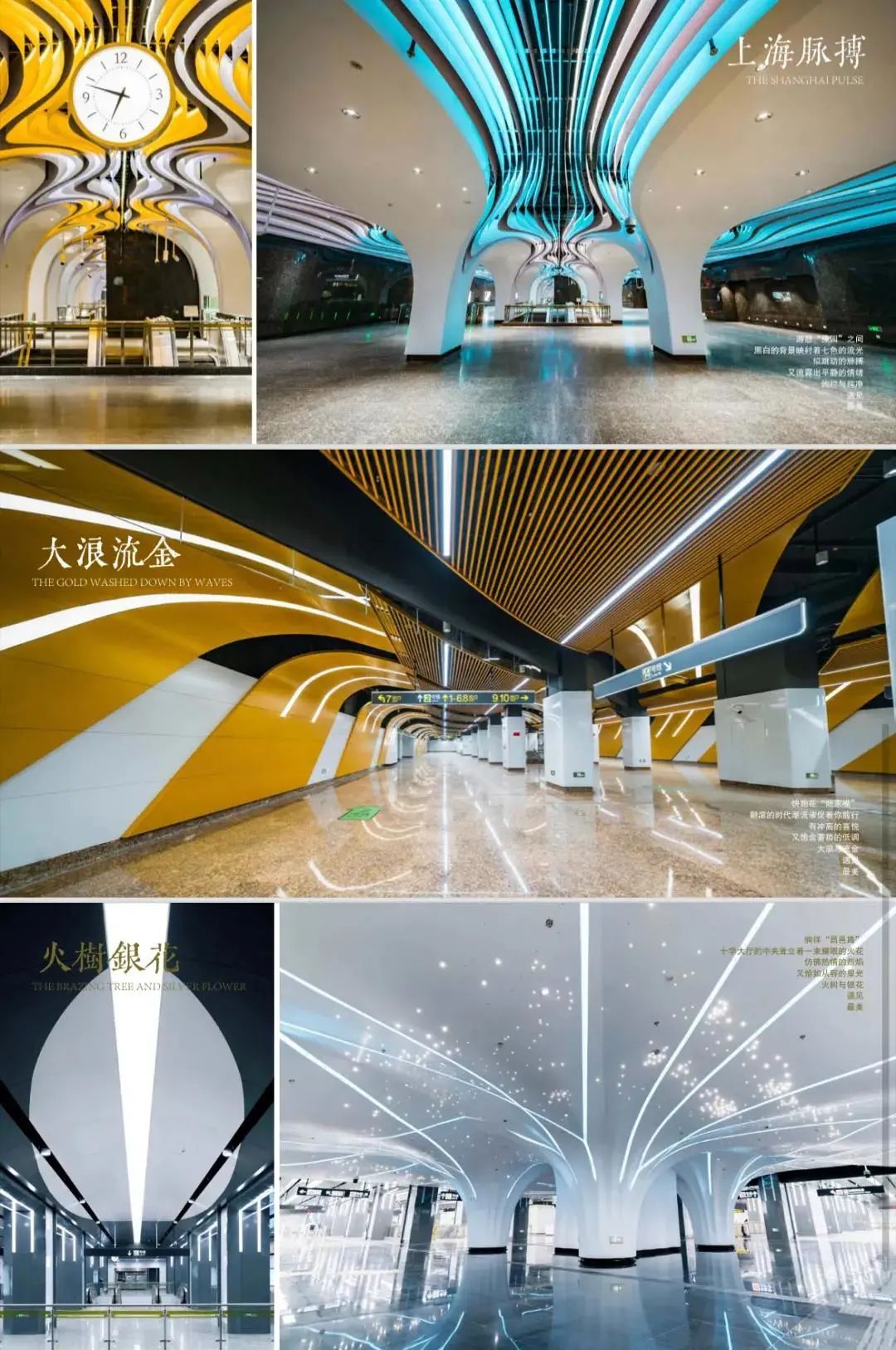 空间更艺术:车站设计引入空间艺术和艺术空间的概念,如豫园站的“上海脉搏”和一大会址·黄陂南路站的“黄陂疏影”车站主题艺术装修、陆家嘴站换乘通道的“今朝踏浪”艺术装置、把二维的平面转化成三维的空间艺术,集功能性、人文性、艺术性于一体,为城市留下可阅读的,有情、有味、有品的城市第二空间,形成了别具特色的装修主题及艺术装置。