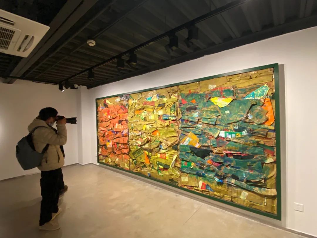 作者宋琪介绍,这幅作品的原材料是自己和两名工人一起从废品回收站带回来的0.5吨快递纸箱。找到这些纸箱时,它们有的还带着残缺的个人信息,有的则是毫无归属感的编码符号。