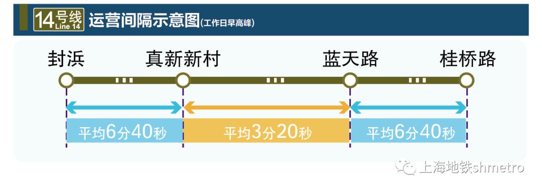 根据运行计划安排,14号线开通初期运营后,全天开行“封浜站至桂桥路站”的大交路,和“真新新村站至蓝天路站”的小交路。小交路和大交路工作日早高峰运营间隔分别为3分20秒和6分40秒,平峰运营间隔分别为6分和12分,晚高峰运营间隔分别为4分和8分。双休、节假日运营间隔分别为5分和10分。