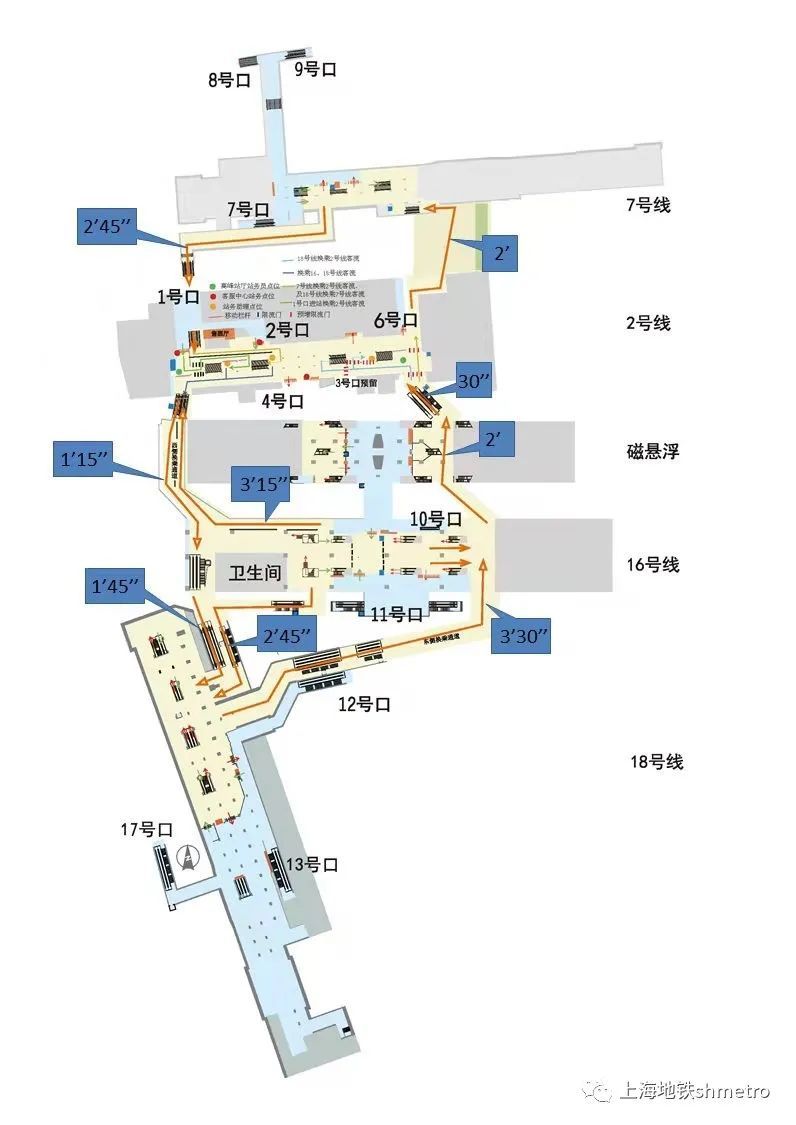以7号线龙阳路站换乘其余三条地铁线路为例(换乘图垂直线左半边路径),乘客自7号线龙阳路站起可沿相应换乘路径依次到达2号线、16号线、18号线。首先沿7号线站厅西段走道换乘至2号线,用时约2分45秒,穿过2号线站厅沿西侧换乘通道到达16号线站厅西端,用时约1分多,此时左转为换乘16号线方向,用时约3分半,继续直行可换乘18号线,用时约1分45秒。