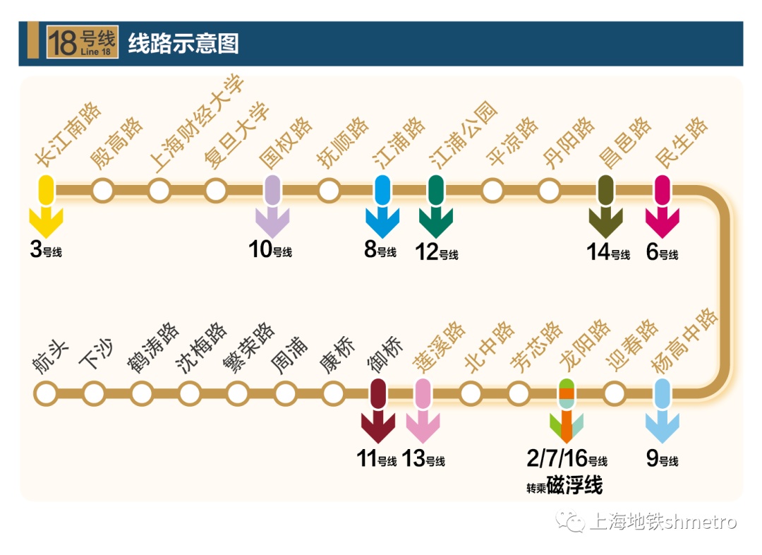 本次开通初期运营的18号线一期北段为去年南段的延伸,运营里程约21公里,设18座车站,全部为地下站。线路南起御桥站(不含),北至长江南路站,途经浦东、杨浦、宝山三个区。