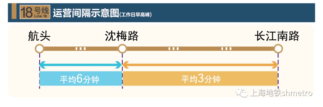 根据运行计划安排,18号线一期北段开通初期运营后,18号线全天开行“航头站至长江南路站”的大交路,和“沈梅路站至长江南路站”的小交路。运行间隔方面,小交路和大交路早高峰运营间隔分别为3分、6分,晚高峰运营间隔为3分30秒、7分。工作日平峰,双休、节假日开行“航头站至长江南路站”单一交路,运营间隔分别为7分、6分30秒。
