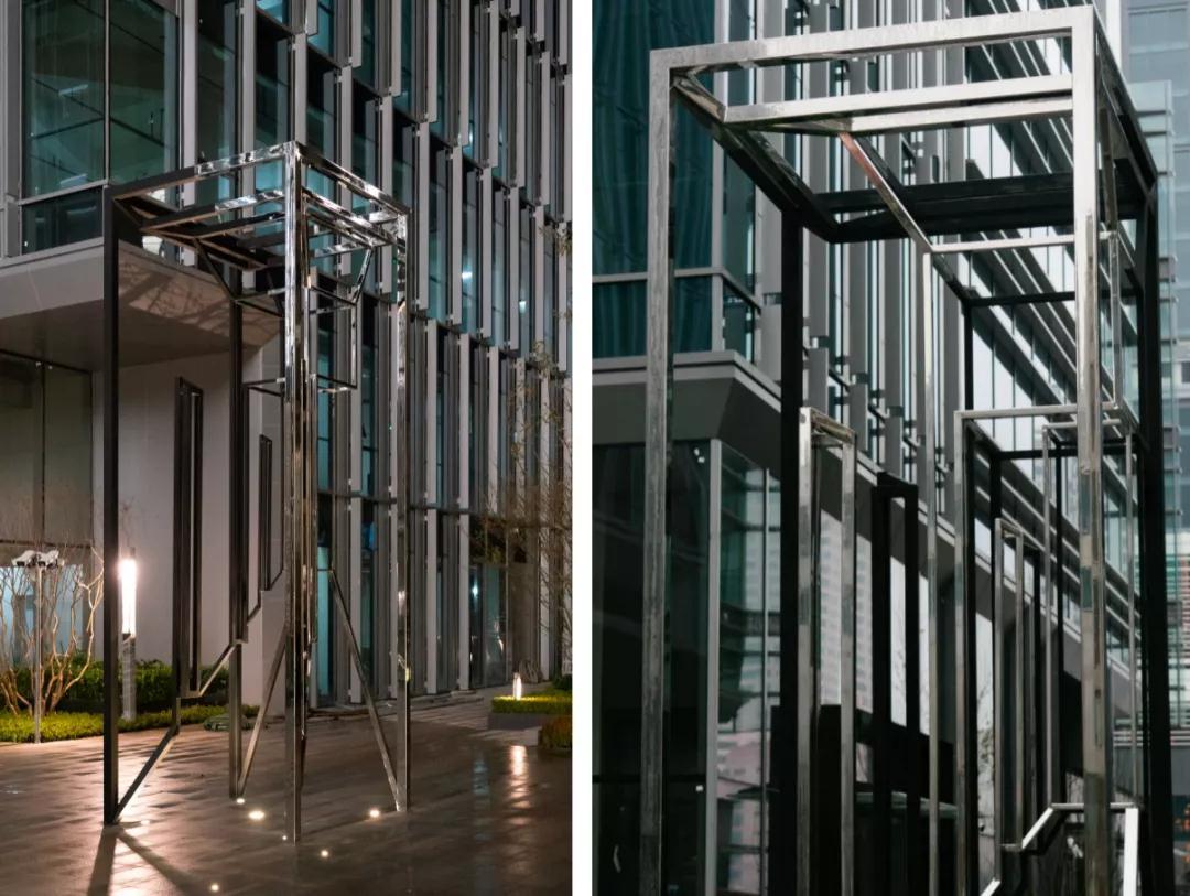 记者在现场看到,《影门》被安放在苏河湾中心双入口的交汇处,以黑色不锈钢作为主立面,简洁硬朗的黑色和镜面不锈钢线条勾勒出一个四面空间廊道,又通过“门”的隐喻建造了一个连接历史与当下的通道,营造过往与现在、真实与虚拟不断切换的体验,令人遥想苏州河沿岸所承载的百年城市风情。