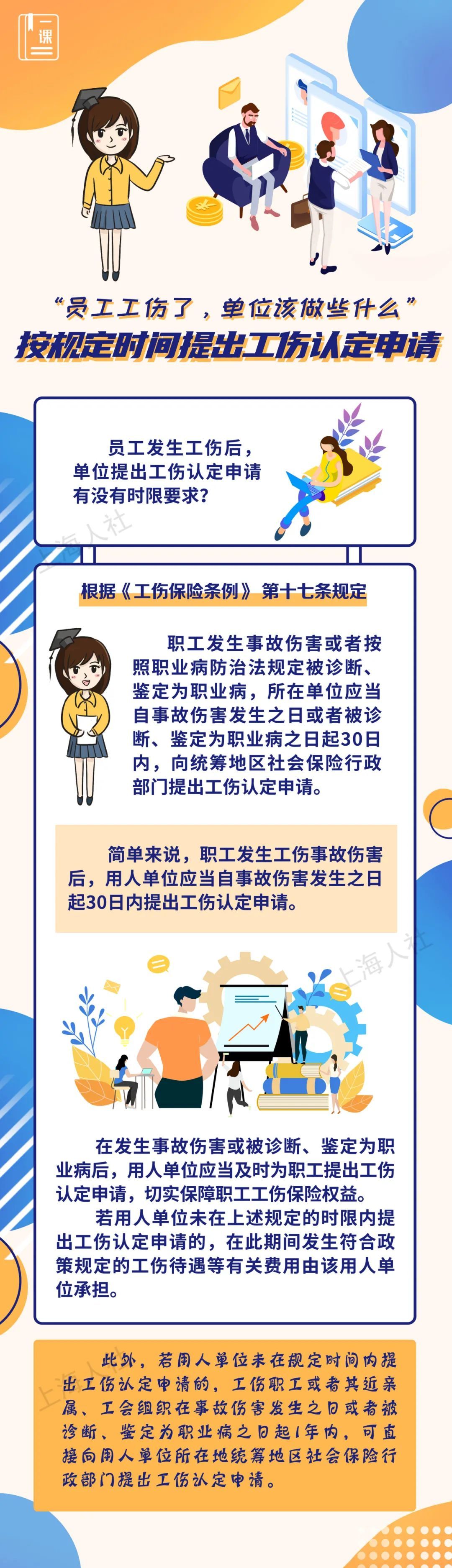 昨天案例中的小蒋在建筑工地发生工伤事故后,被立即送往了本市定点医疗机构救治。公司表示最近由于要赶项目进度,等小蒋伤情稳定后再为其申请工伤认定。那提出工伤认定申请到底有没有时限要求呢?来听听粒粒博士怎么说。