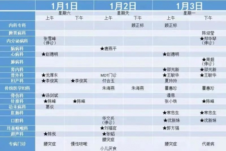 专家门诊:正常开诊(外聘及退休专家1月1日-3日停诊)。