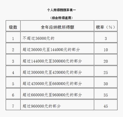 具体而言,按照个人所得税综合所得税率表您本年度工资薪金累计应纳税所得额在不超过36000元时对应3%的税率,超过36000元至144000元的部分对应10%的税率,以此类推,共分七档。